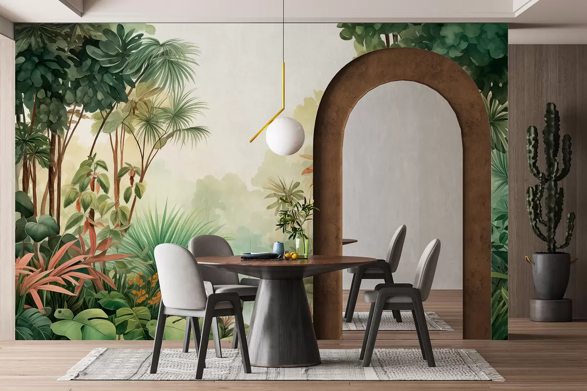 Fotobehang Aquarel oerwoud, palmbomen, meer, groen N° w01784