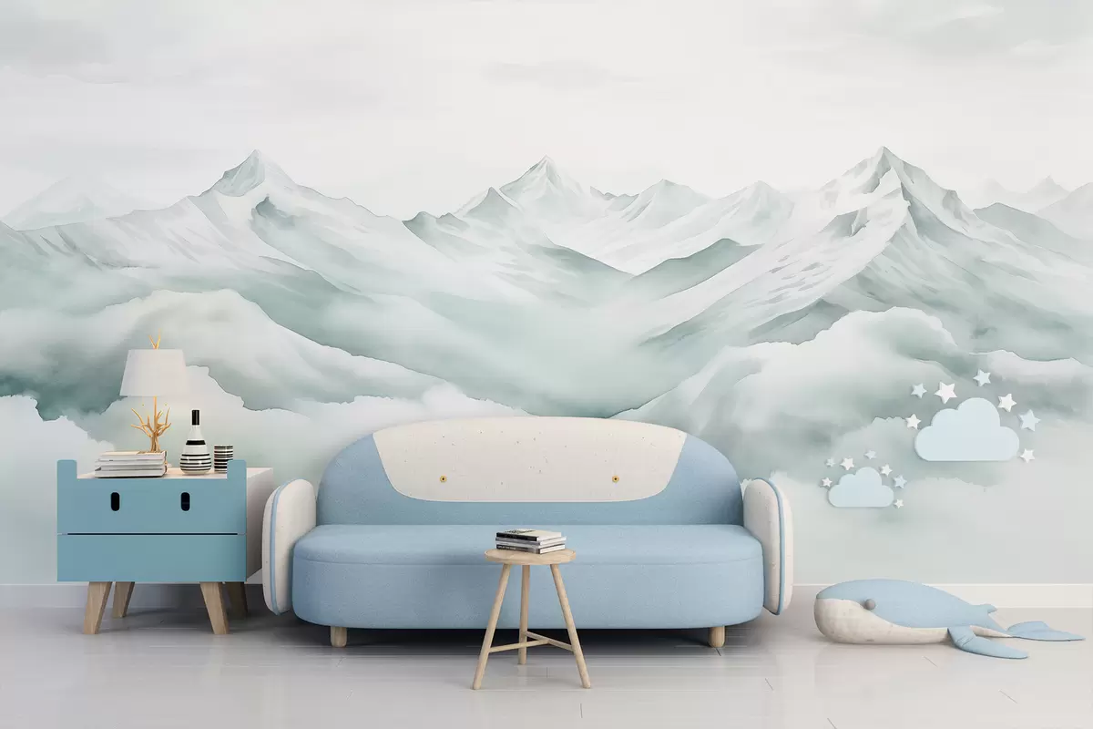 Fotobehang Bergen landschap, aquarel, zachte blauwe kleuren N° w01787v2