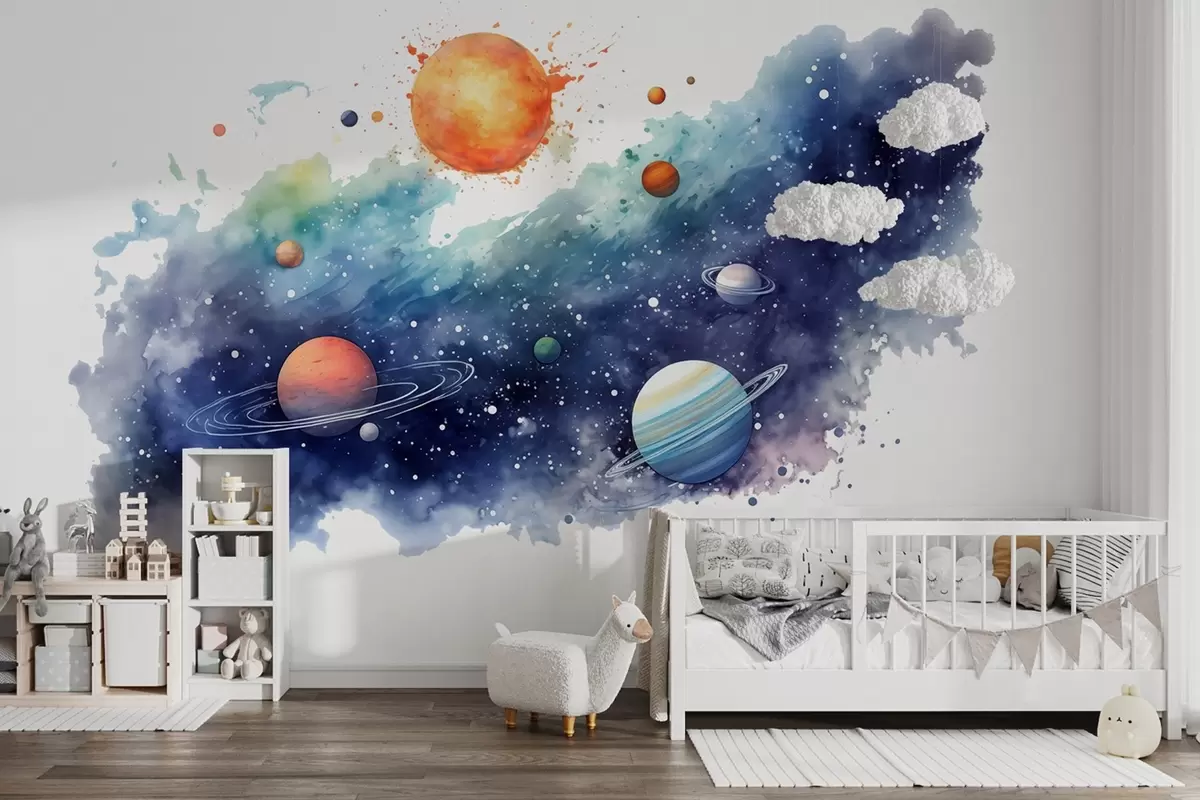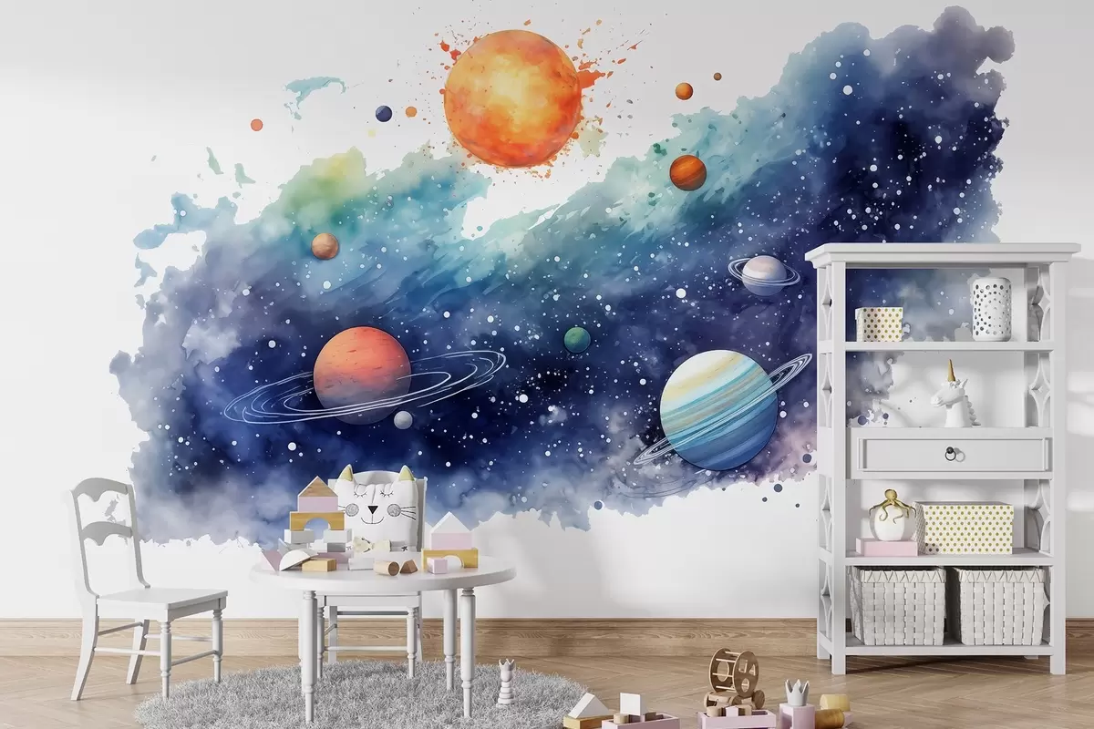 Fotobehang Aquarel ruimte, planeten, zon, sterren N° w01803