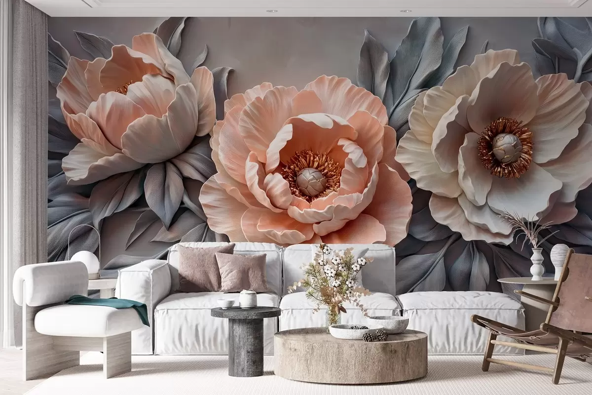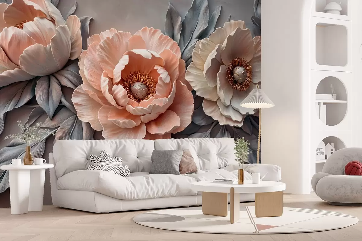 Fotobehang Florale roze pioenrozen met bladeren en bloemblaadjes in gedempte pastelkleuren, sculpturale bas-reliëfstijl N° w01824