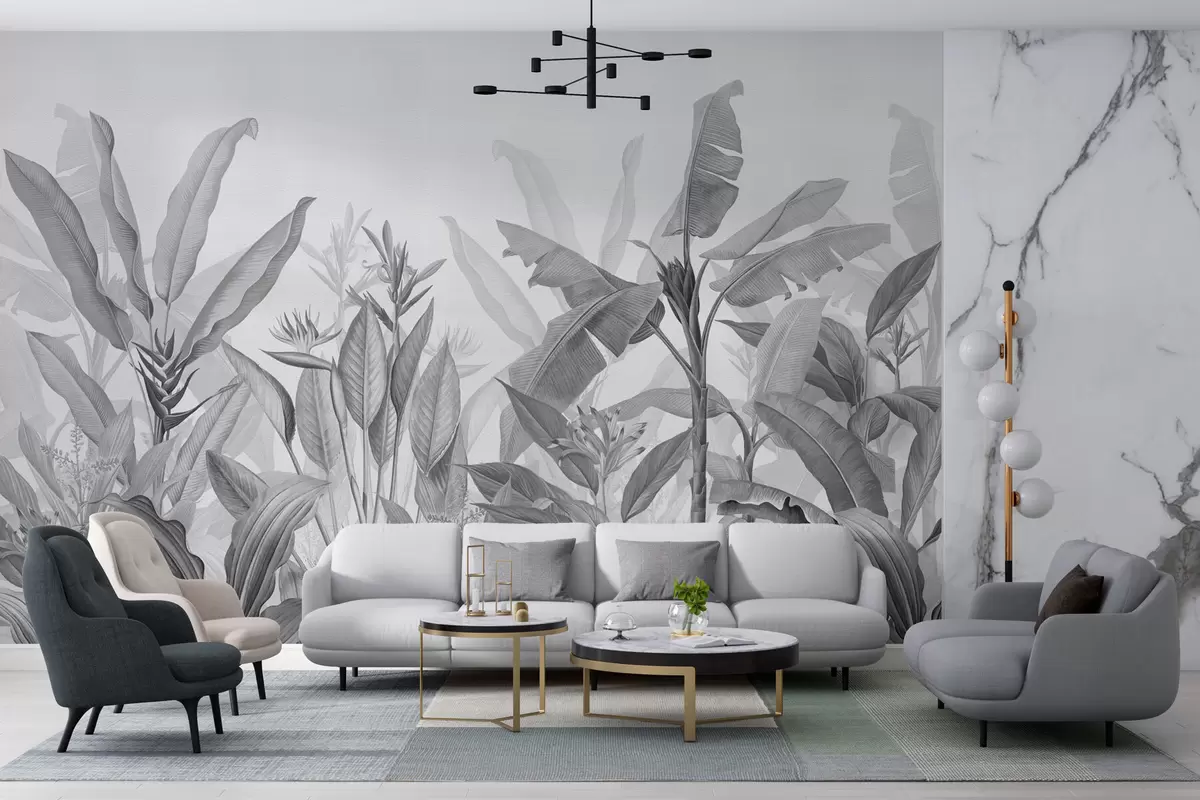 Fotobehang Zwart-witte tropische bladeren en bloemen op een lichte achtergrond N° w01834v3