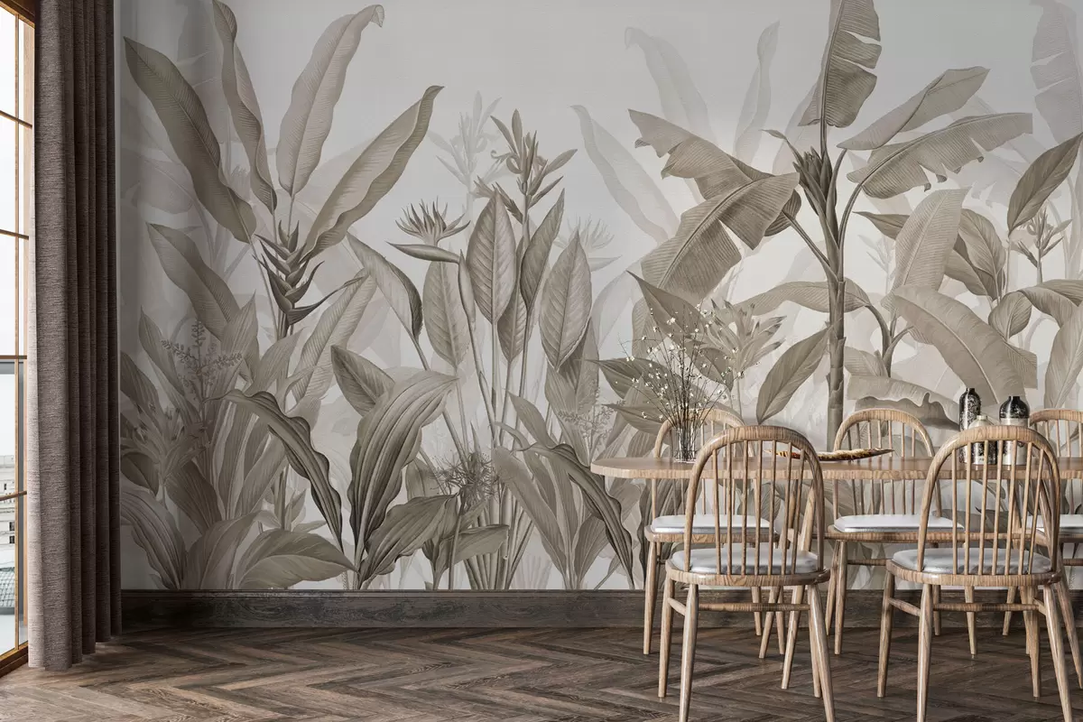 Fotobehang Tropische bladeren en bloemen op een lichte achtergrond in sepiastijl N° w01834v4