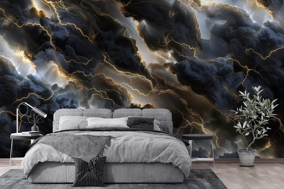 Fotobehang Zwarte wolken met bliksem die eruitzien als marmer N° w01936