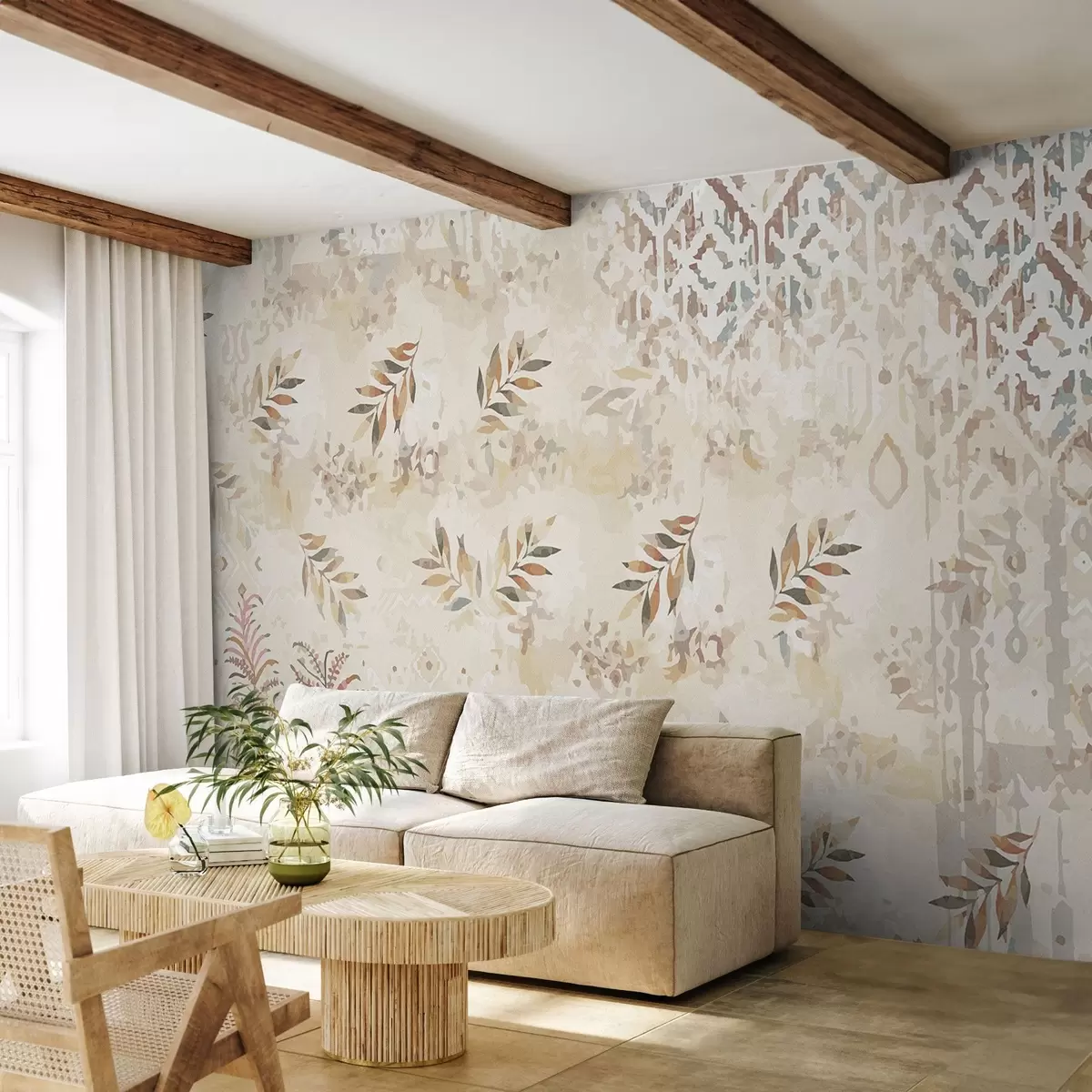 Fotobehang behang in retrostijl met patronen, slijtage-elementen, vlekken en bladeren, in beige kleuren N° w01955