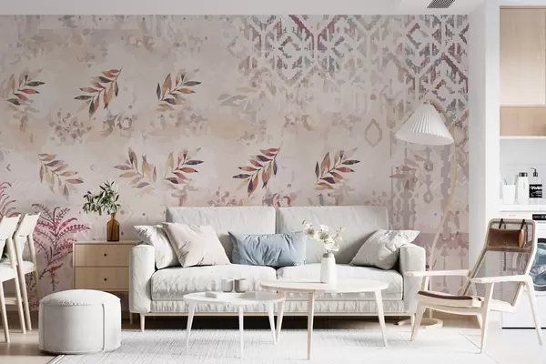 Fotobehang behang in retrostijl met patronen, slijtage-elementen, vlekken en bladeren, met een paarse tint N° w01955v1