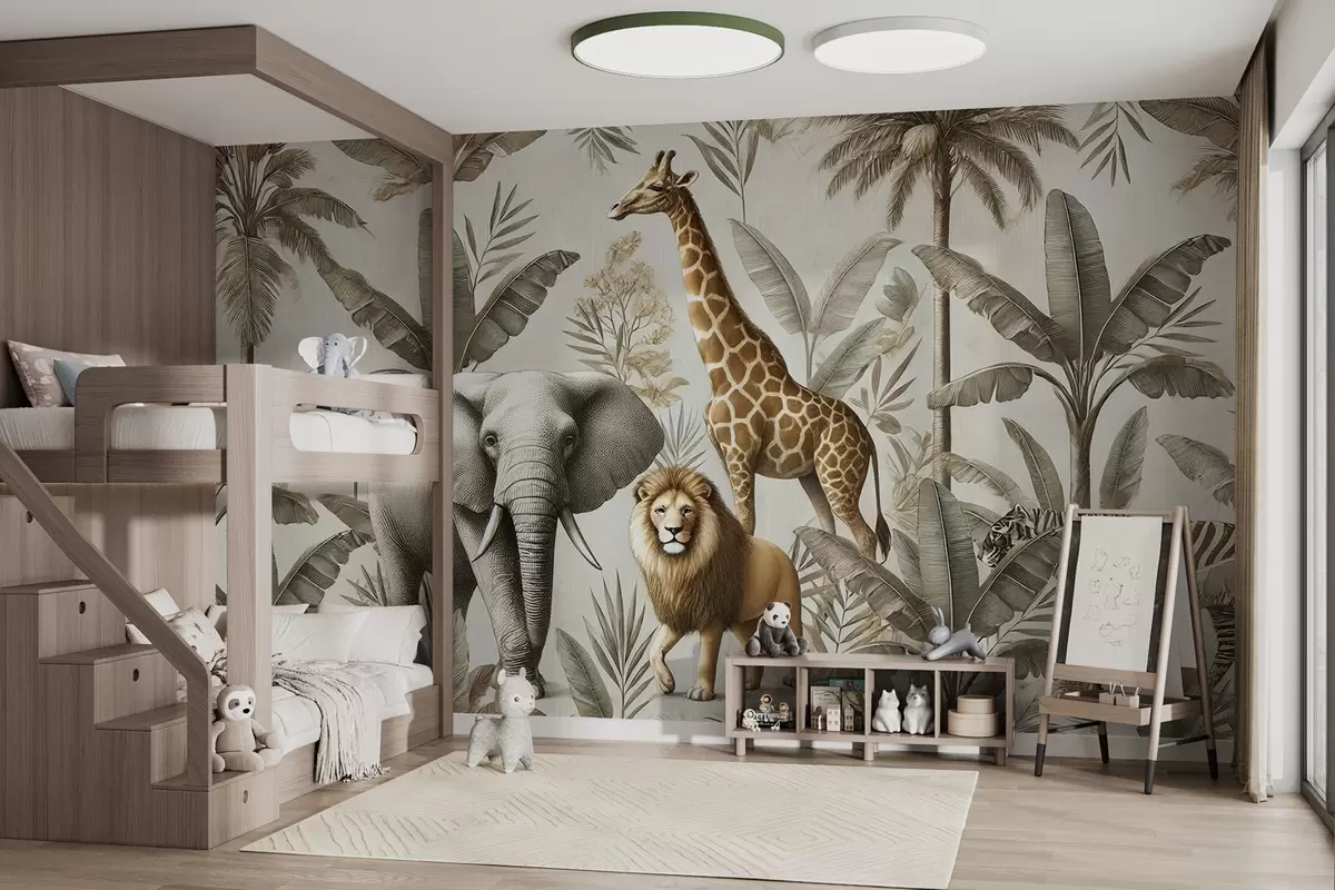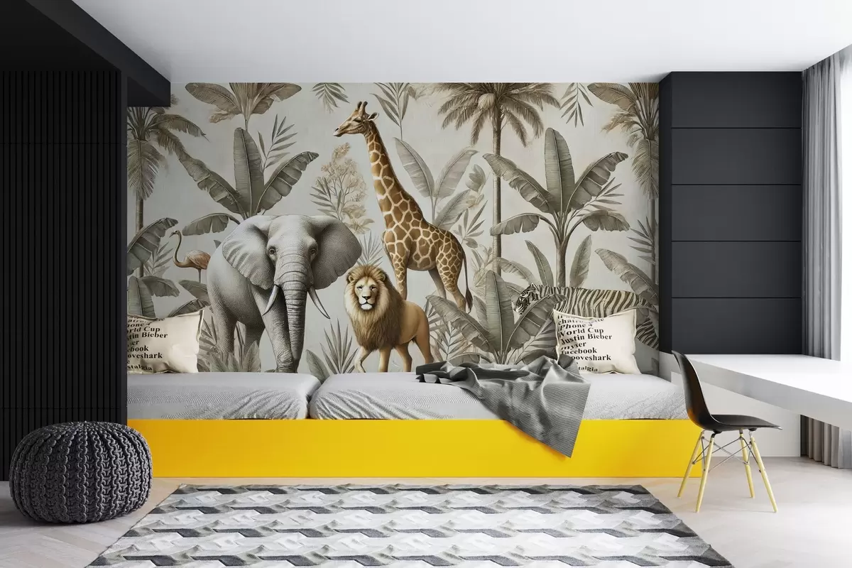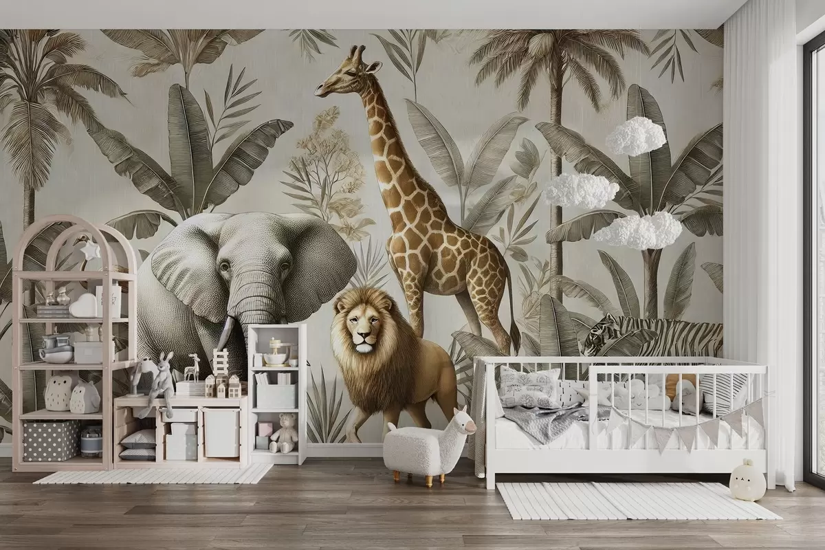 Fotobehang Safari kinderbehang met tropisch landschap en verschillende dieren in elegante kleuren N° w01956
