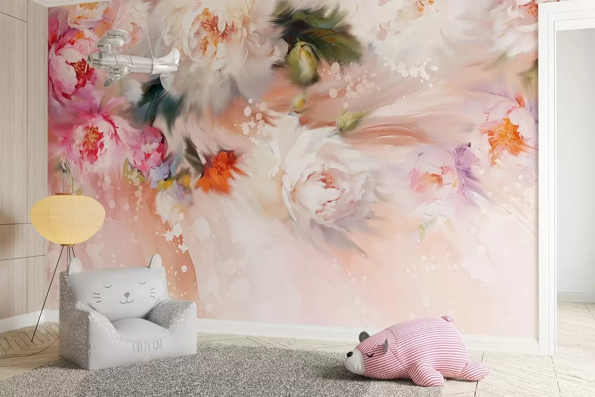 Fotobehang Acryl pioenrozen, penseelstreken, bloemig, zachte pastelkleuren N° w02021