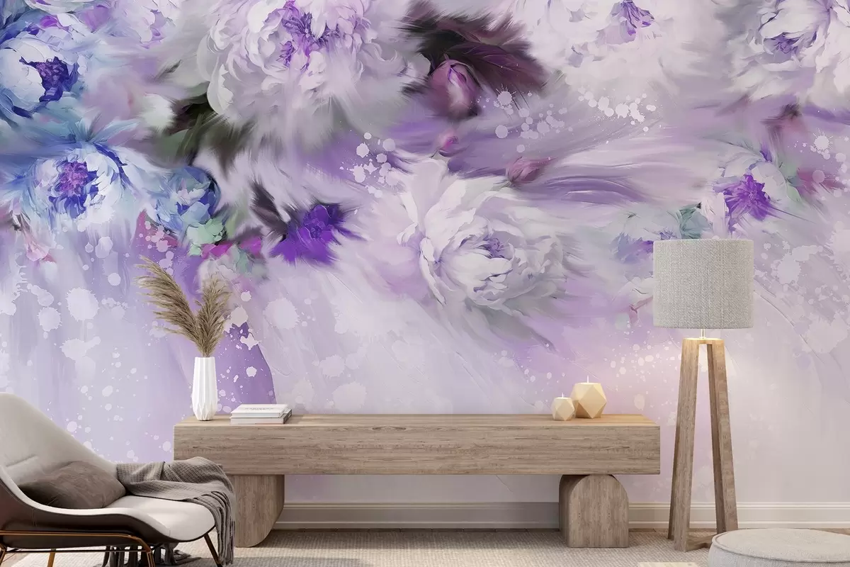 Fotobehang Acryl pioenrozen, penseelstreken, bloemig, zachte pastel paarse kleuren N° w02021v3