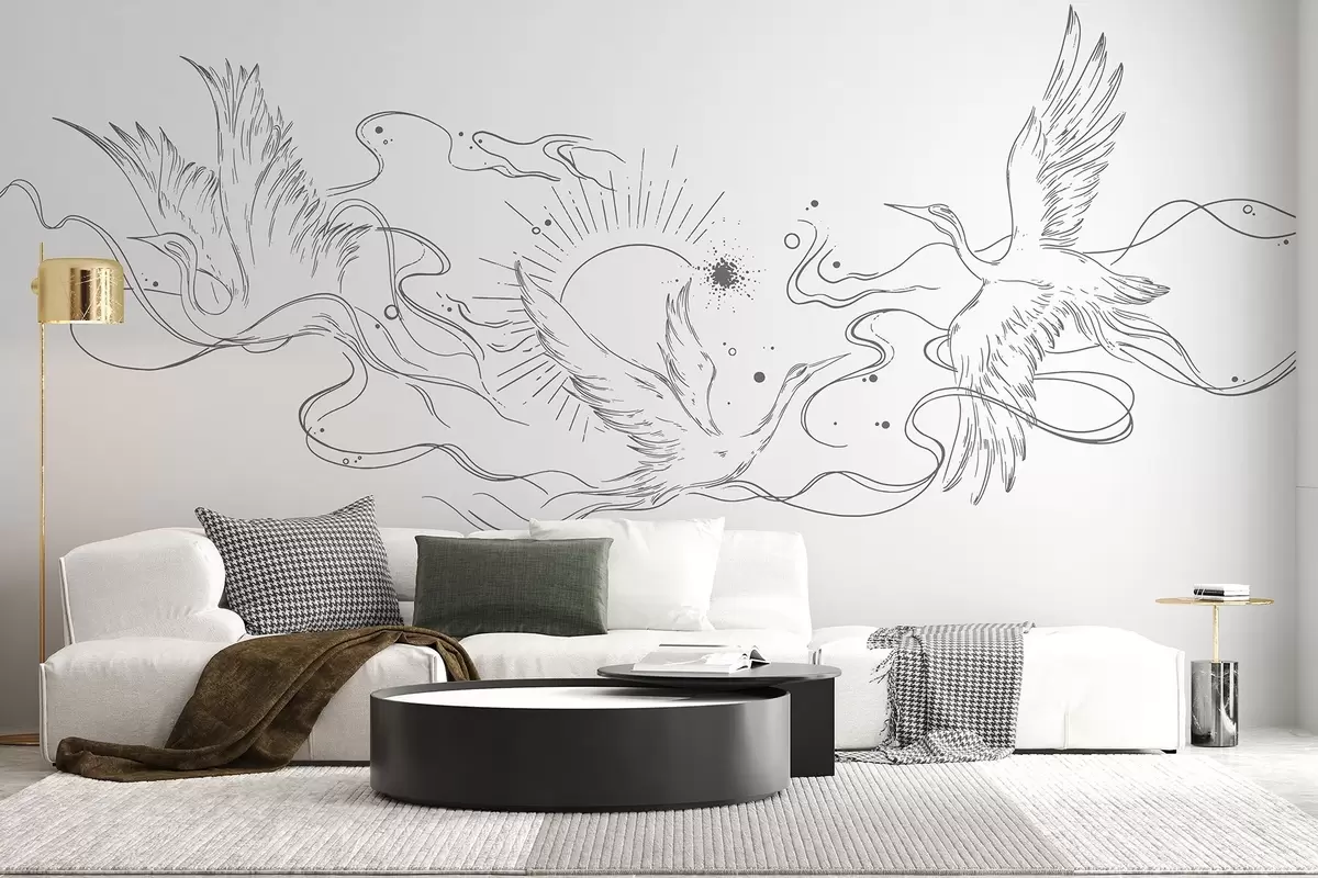 Fotobehang Vliegende vogels, lijntekening, minimalisme, grijs kleurenpalet N° w02022v2