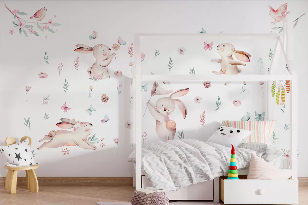 Fotobehang Sprookjeskonijntjes in bloemen N° w02025