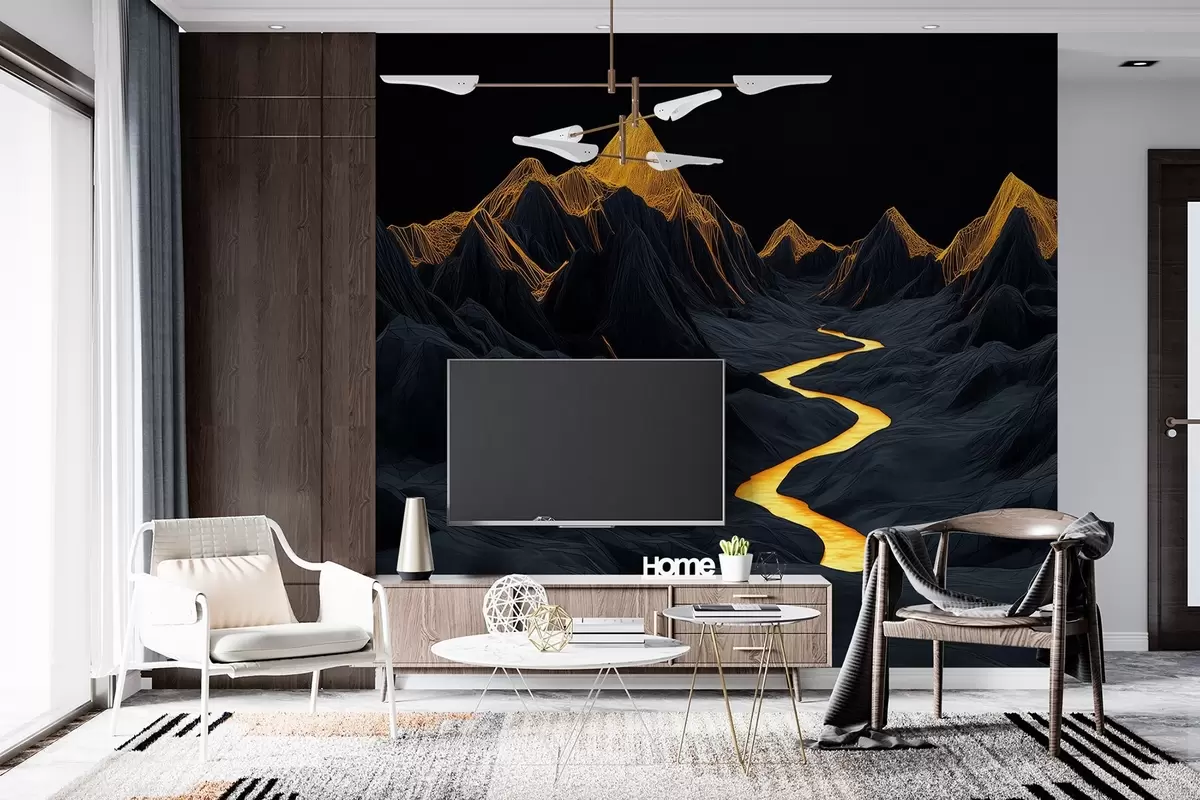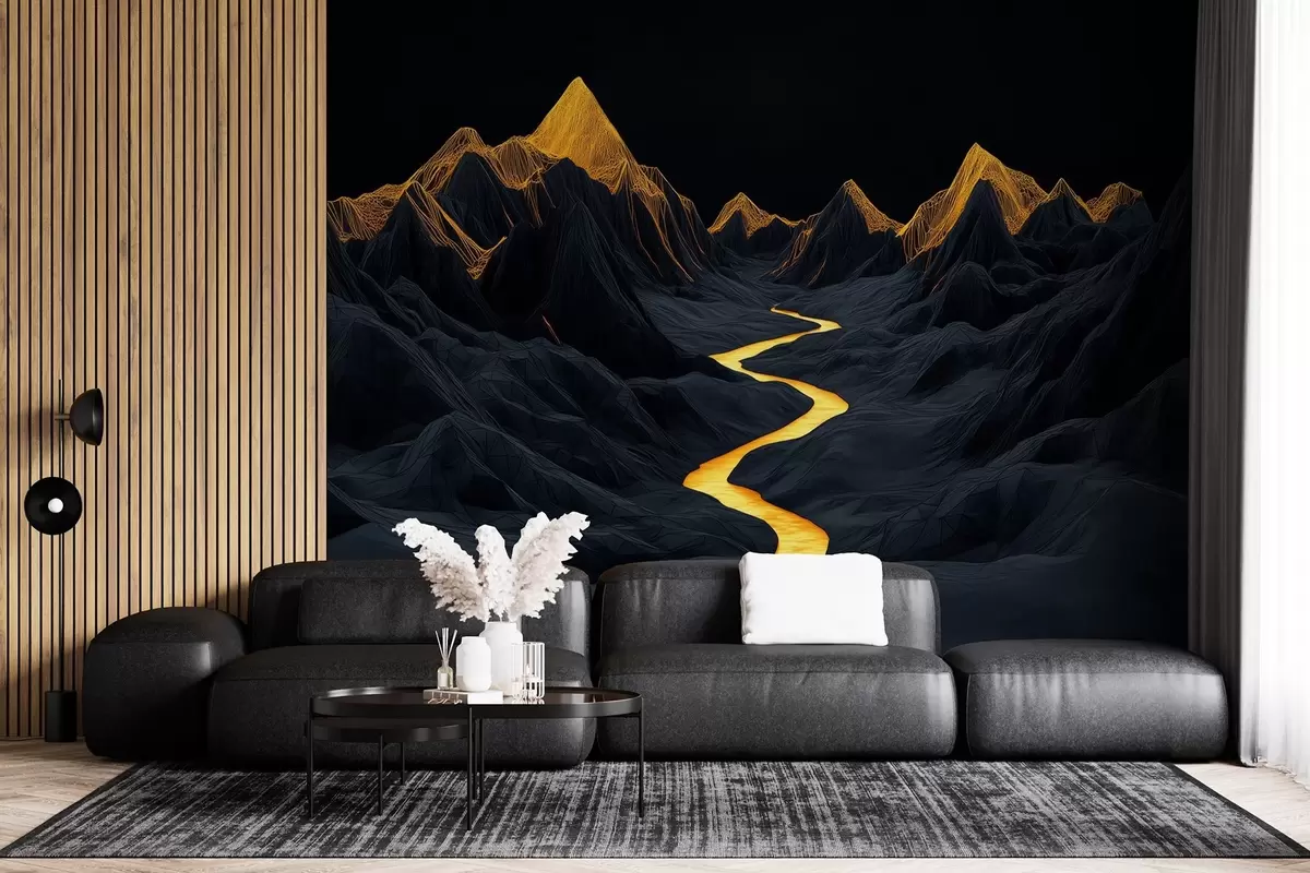 Fotobehang Veelhoekig zwart landschap en een rivier tussen de bergen N° w02063