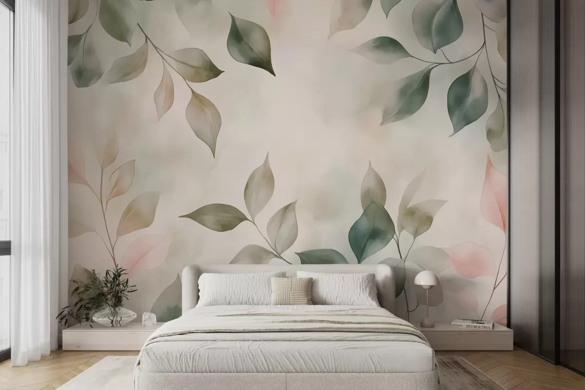 Fotobehang Saliegroen en roze gebladerte in aquarelverf N° w02069