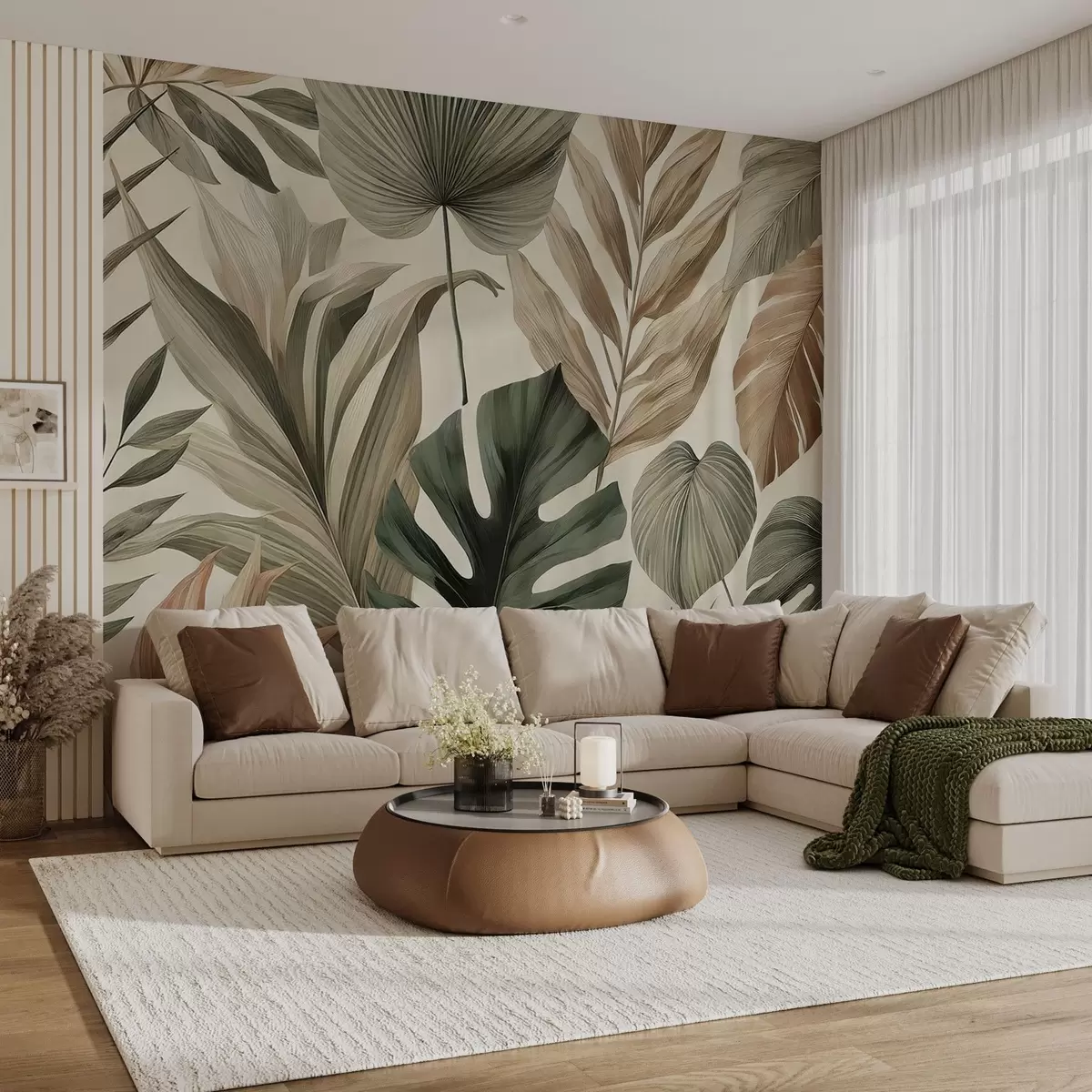 Fotobehang Grote tropische bladeren in ingetogen delicate pasteltinten N° w02082