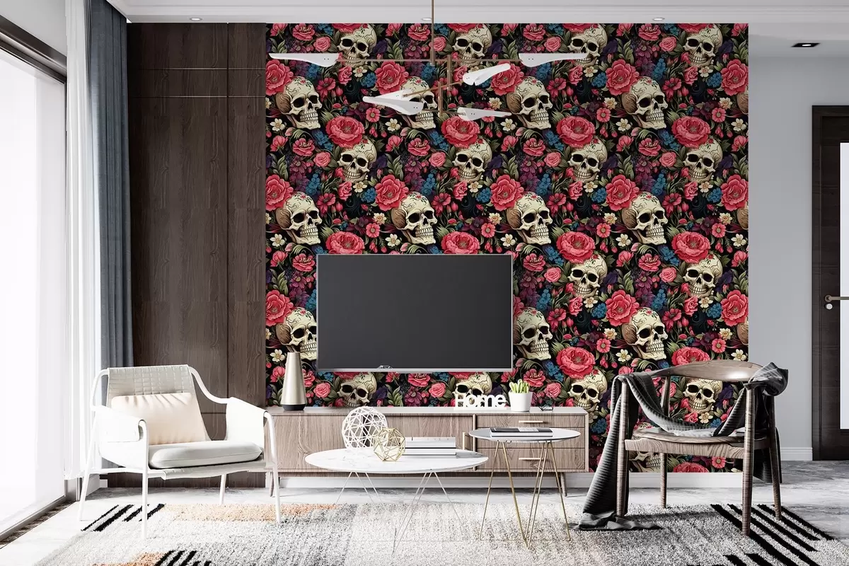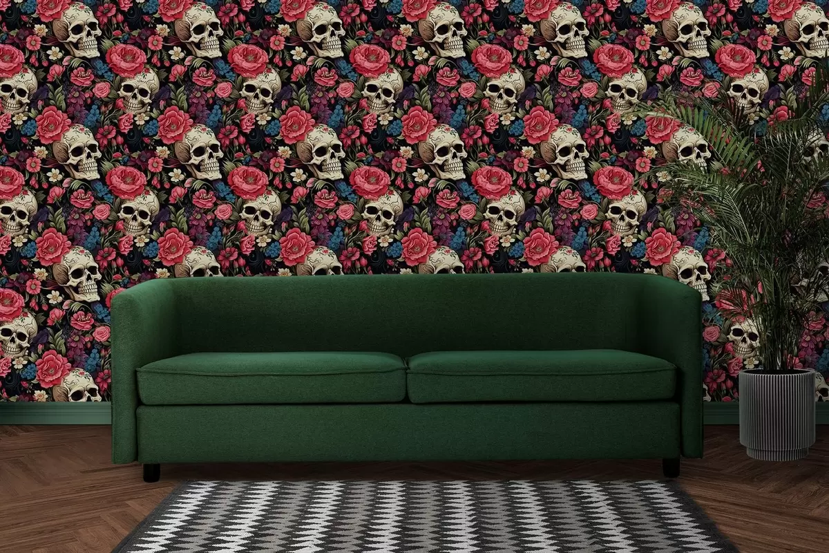 Fotobehang Mystiek behang in retrostijl met schedelpatroon en bloemen in roze tinten op een donkere achtergrond N° w02084
