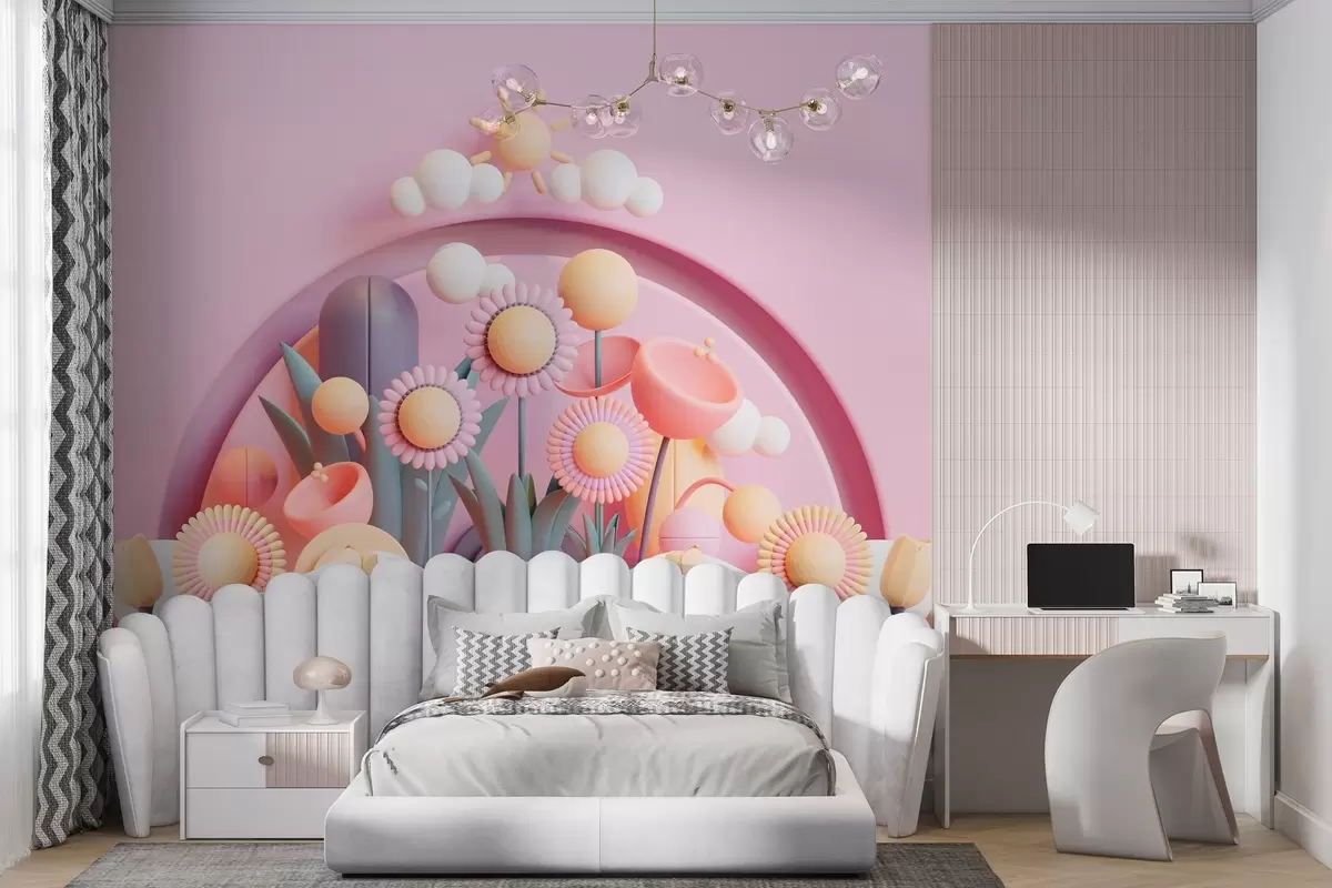 Fotobehang Kinderbehang in 3D-stijl met bloemen en wolken in roze tinten N° w02136