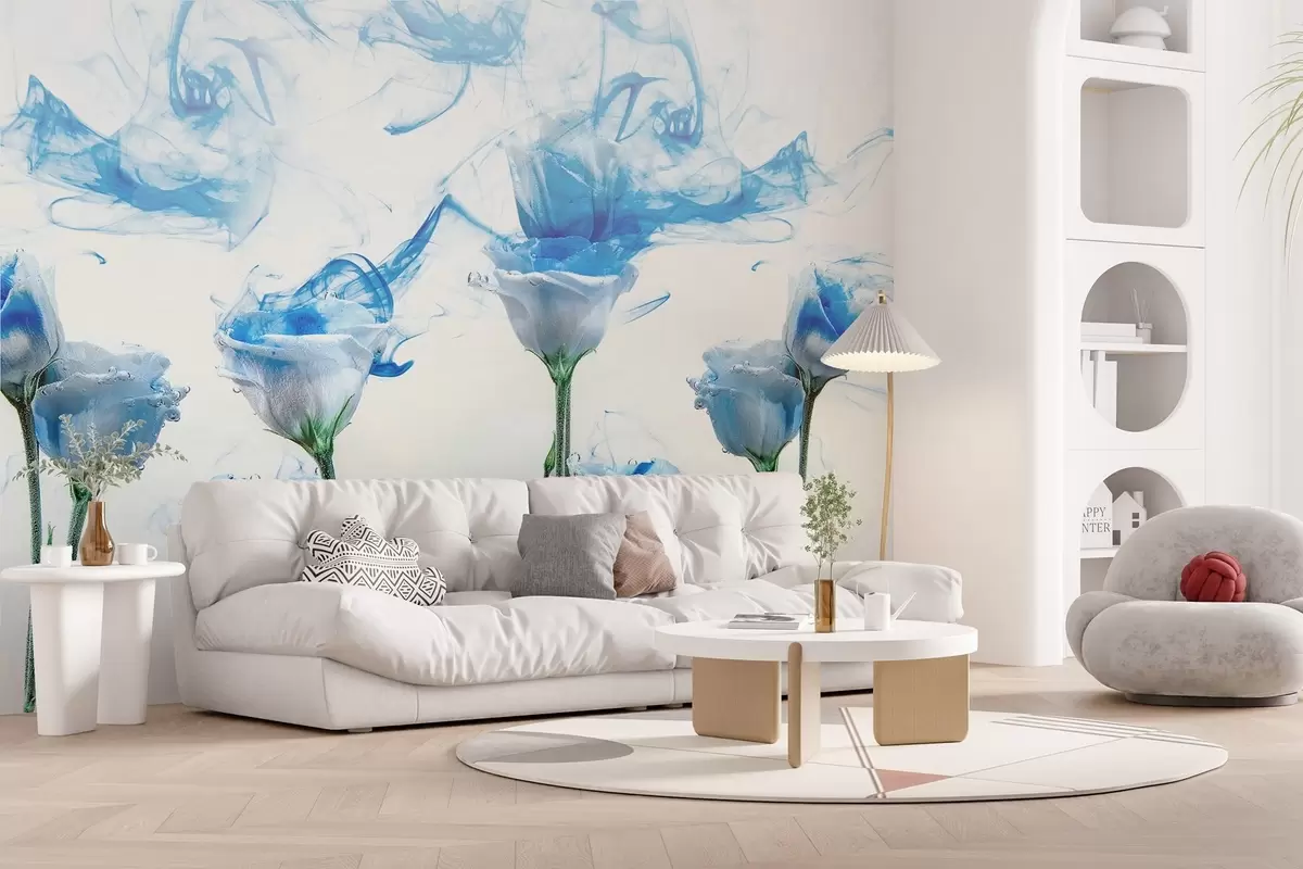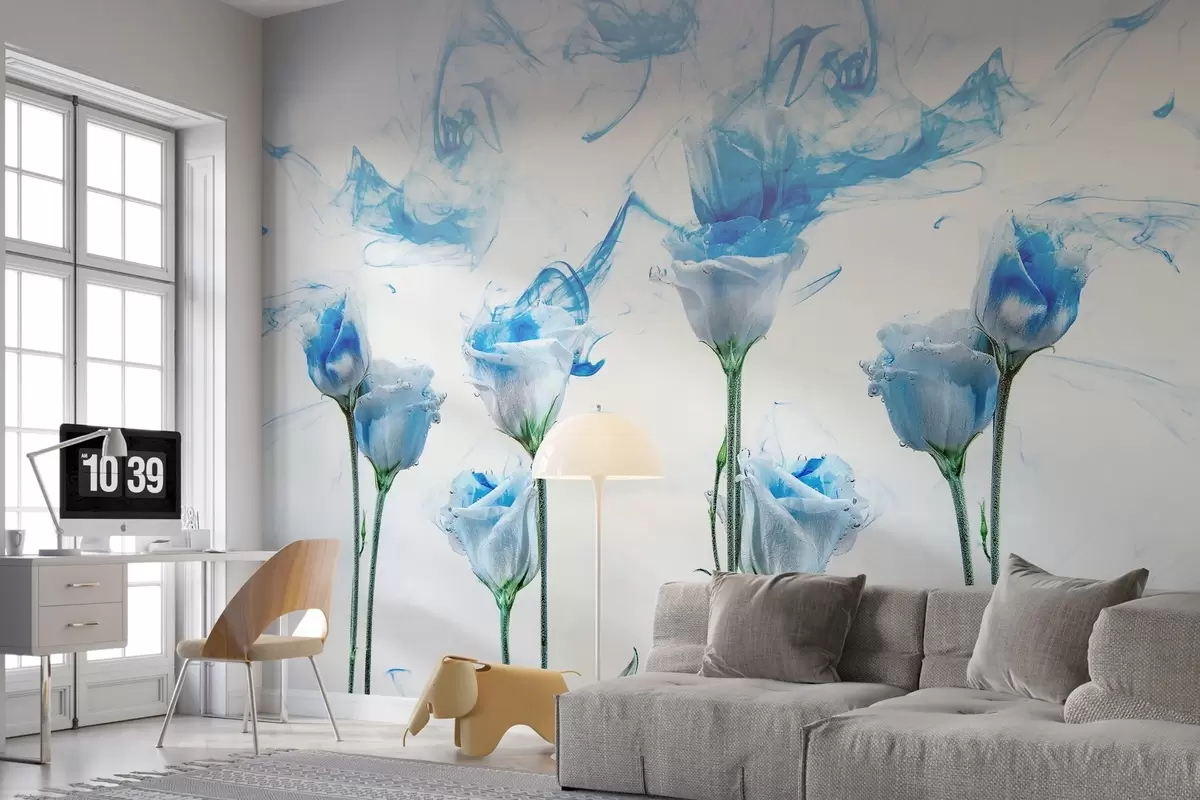 Fotobehang Witte rozen onder water op een witte achtergrond met blauwe acrylverf strepen. N° w02139