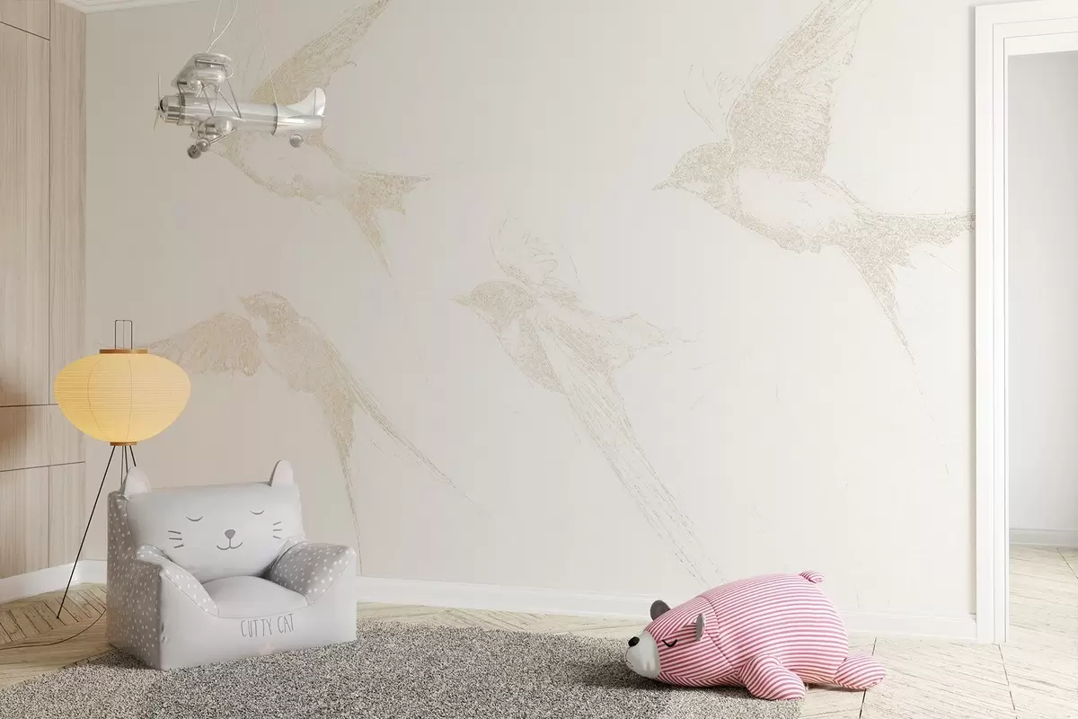 Fotobehang Vliegende vogels, potloodtekening, minimalisme, zachte beige kleuren N° w02154