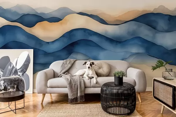 Fotobehang Abstracte blauw-beige golven die doen denken aan bergen N° w02196
