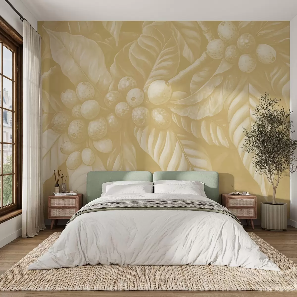 Fotobehang Takken koffieplant met vruchten en tropische elementen in beige tinten N° w02209v1