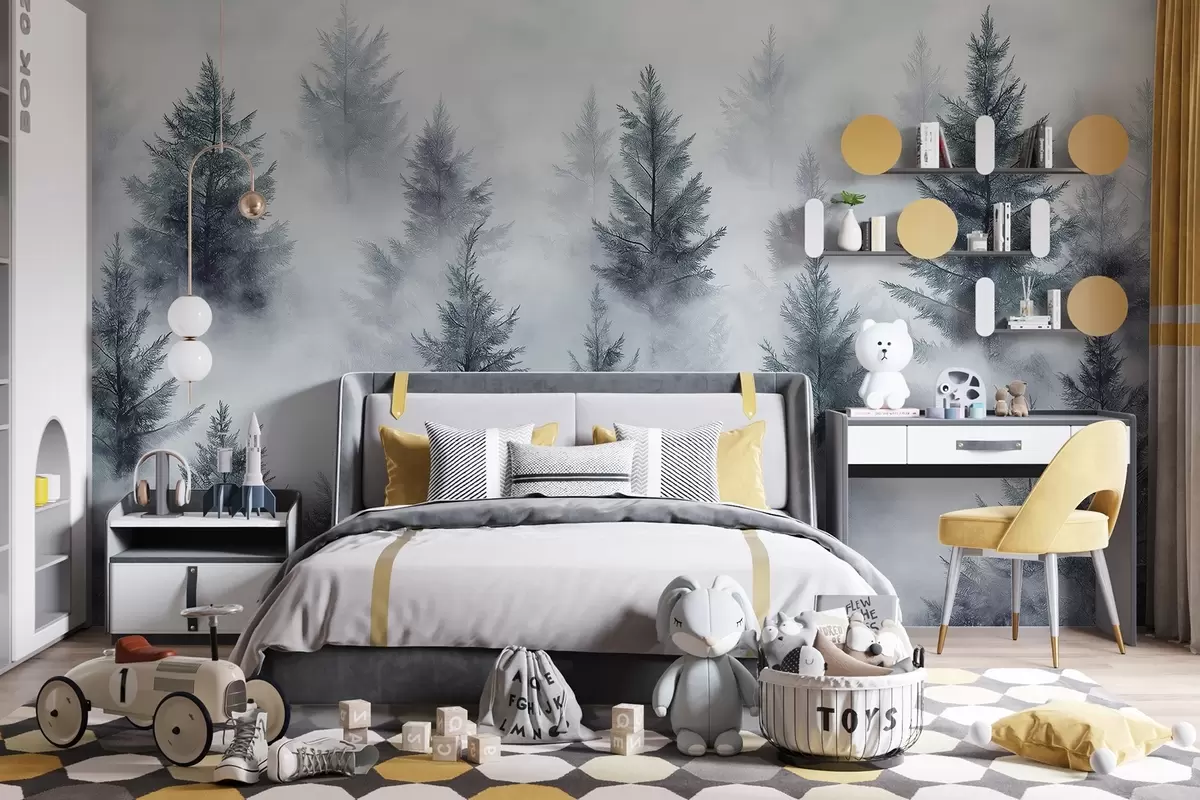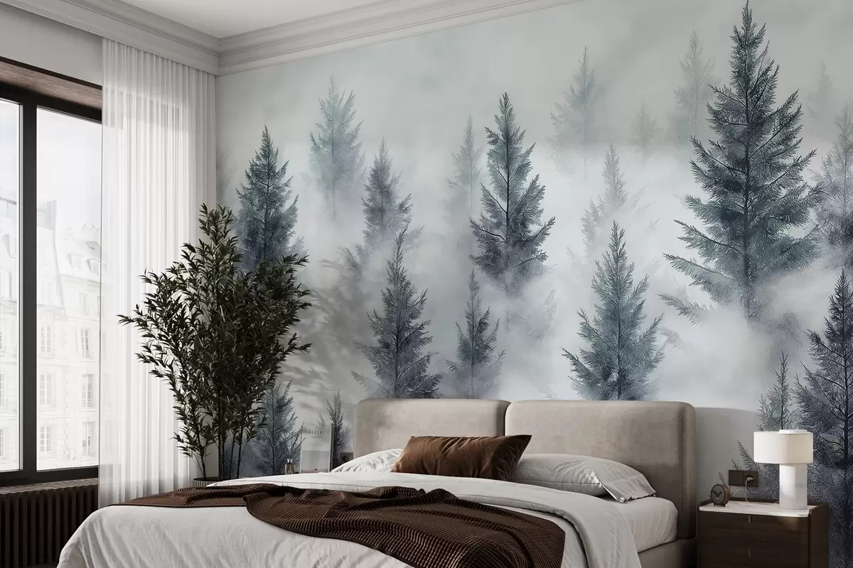 Fotobehang Mooi bos met pijnbomen, mist, natuurlandschappen, grijze kleuren N° w02222v2