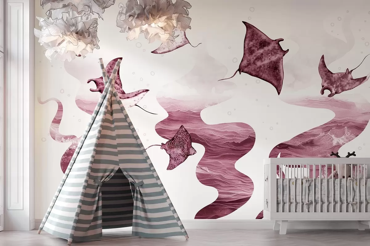 Fotobehang Manta vissen, aquarel stijl, zee, oceaan, roze kleuren N° w02266v3