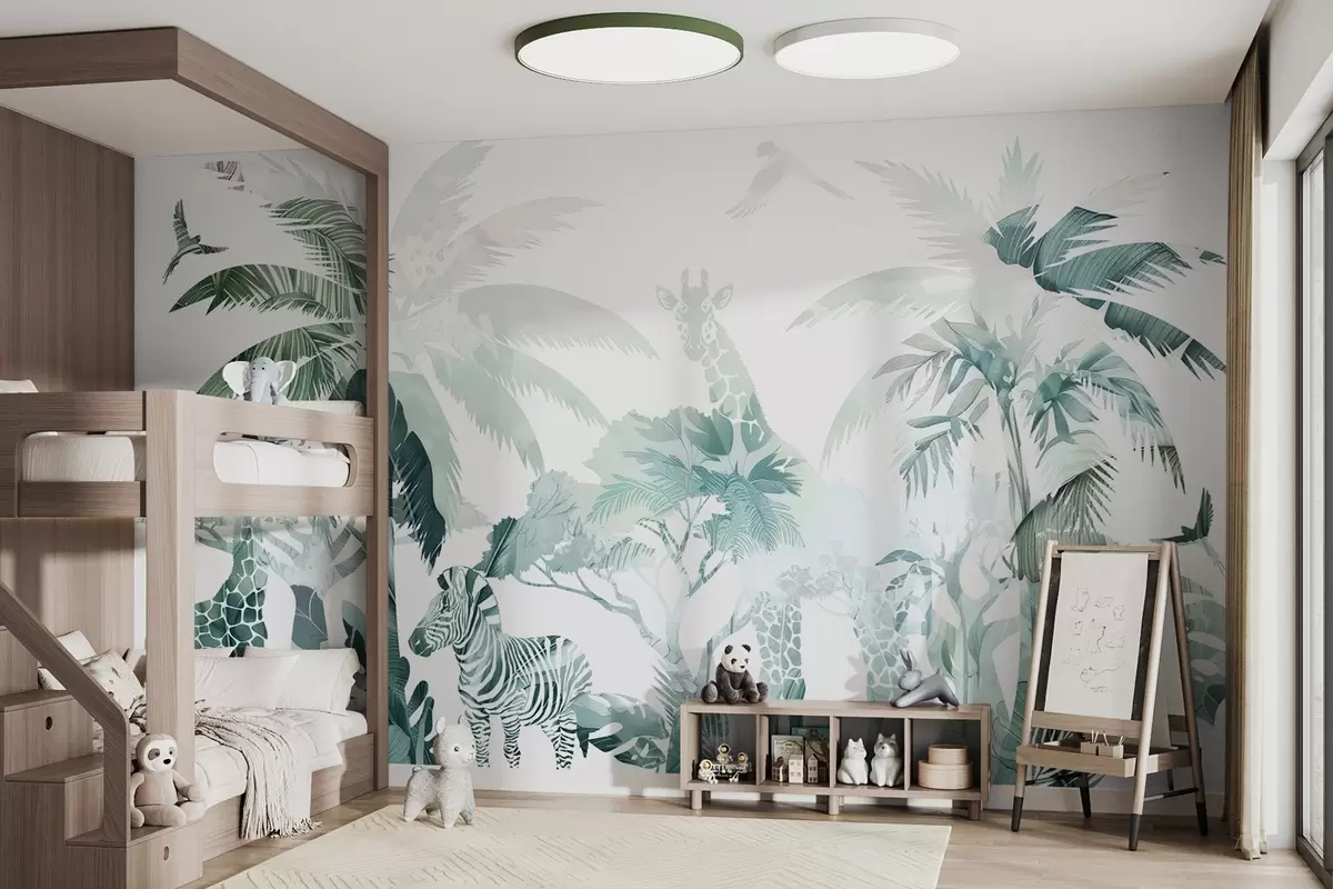 Fotobehang Safari dieren, palmbomen, jungles, zebra, giraffe, zachte groene kleuren N° w02267