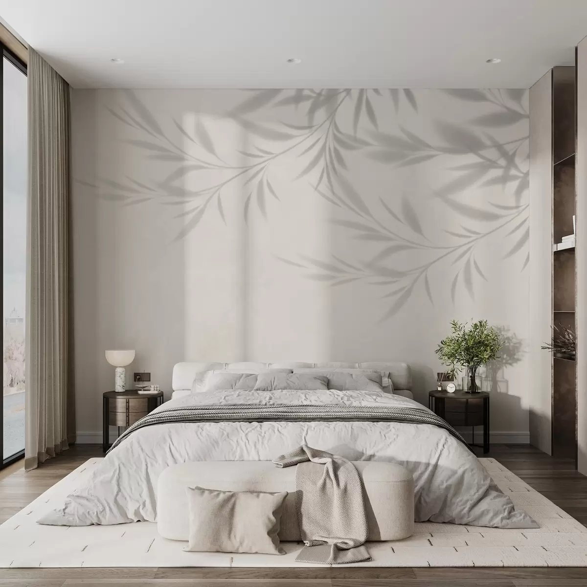 Fotobehang Schaduw van takken en bladeren op een beige achtergrond N° w02283v1