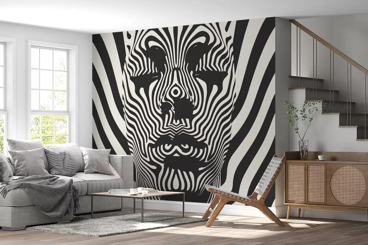 Fotobehang Op art stijl trellis met abstract gezicht, golvende lijnen op lichtgekleurde achtergrond. N° w02285