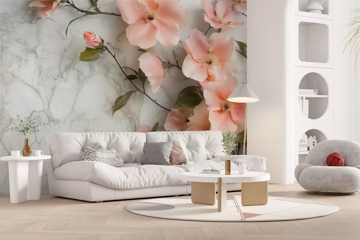 Fotobehang Delicate bloemen op de achtergrond van marmerimitatie N° w02291