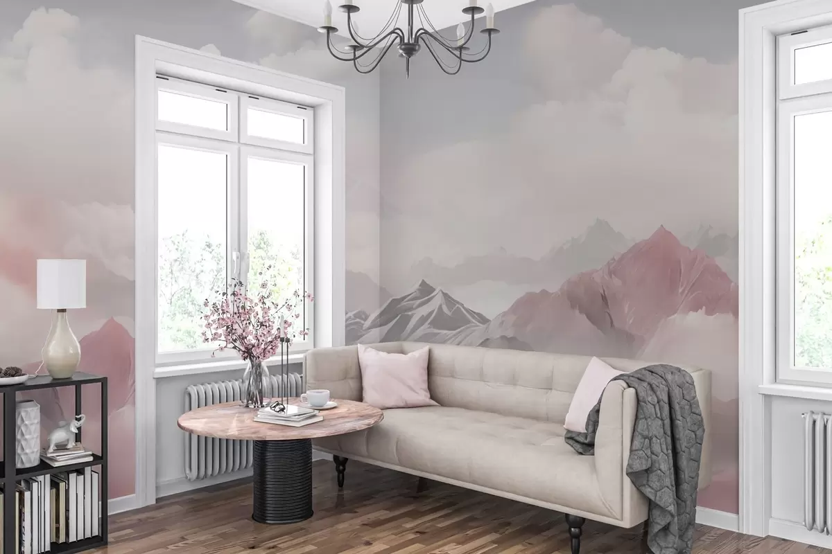Fotobehang Roze bergen in mist en gezwollen wolken N° w02296