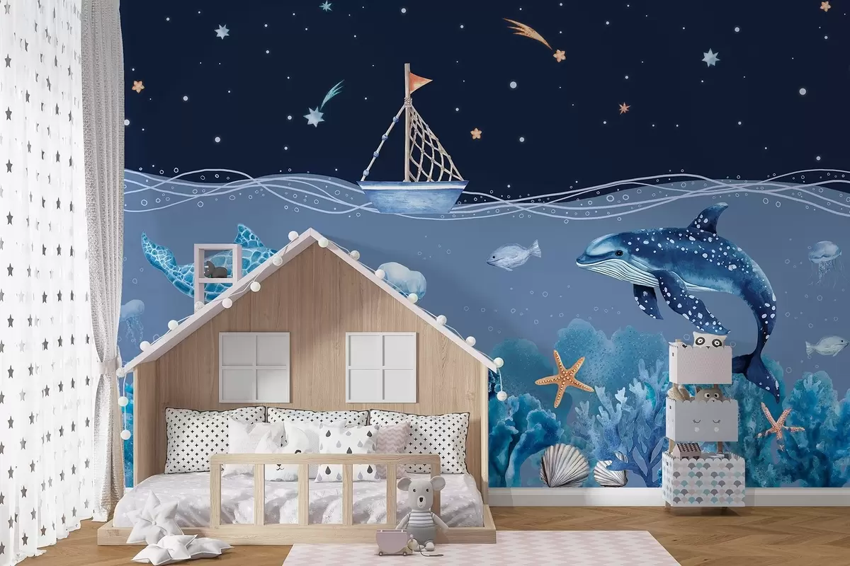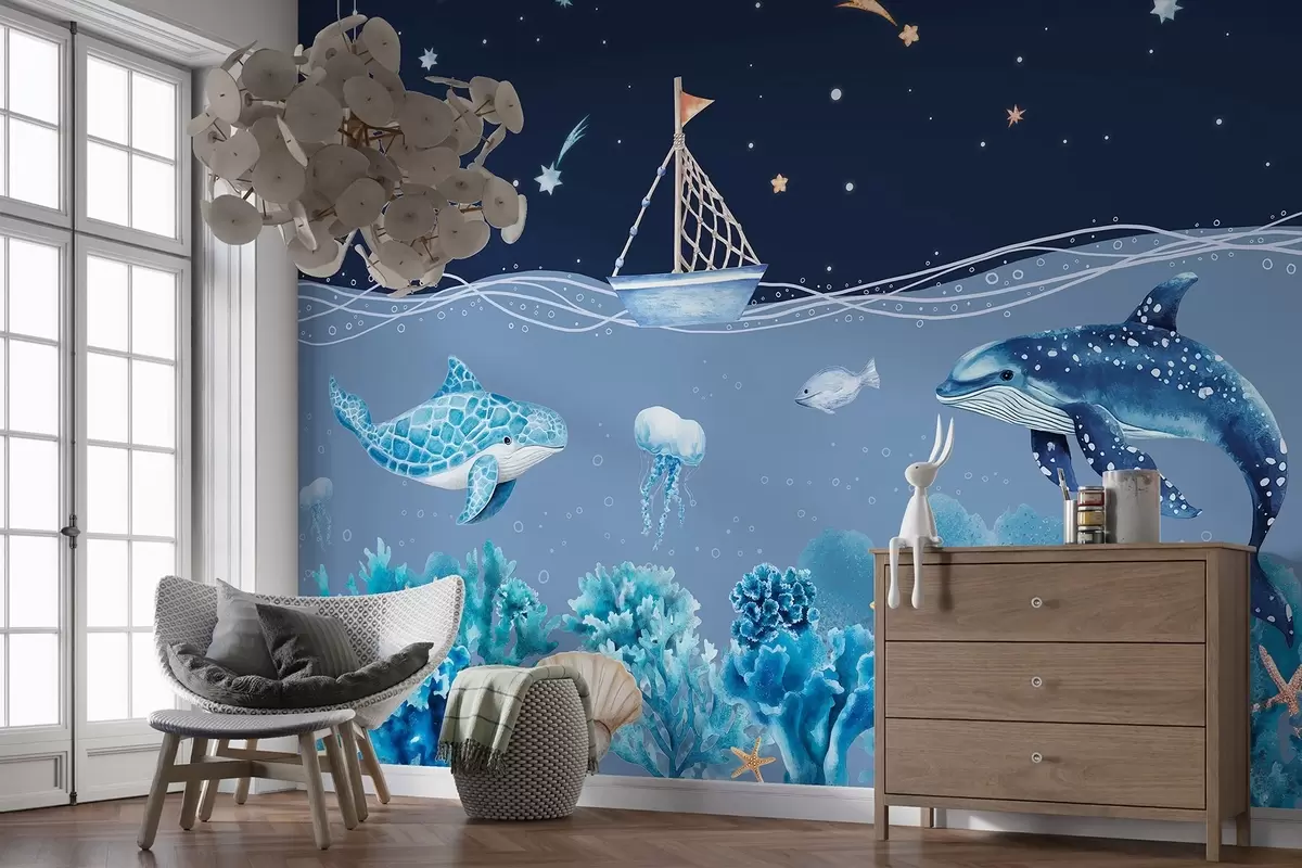 Fotobehang Zeeleven, aquarelstijl, koralen, boot, dolfijn, kwal, sterrenhemel, blauwe kleuren N° w02310