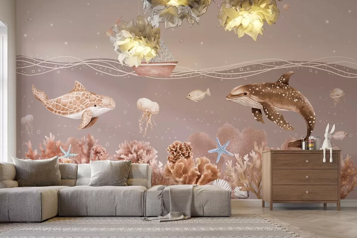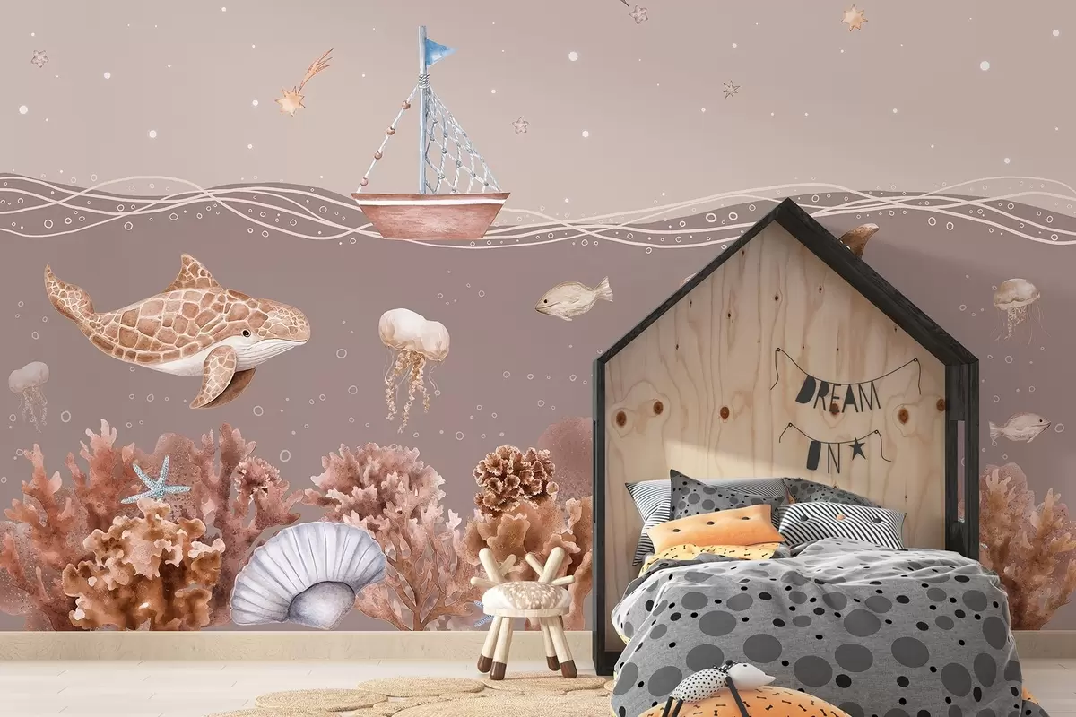 Fotobehang Zeeleven, aquarelstijl, koralen, boot, dolfijn, kwal, sterrenhemel, beige kleuren N° w02310v4