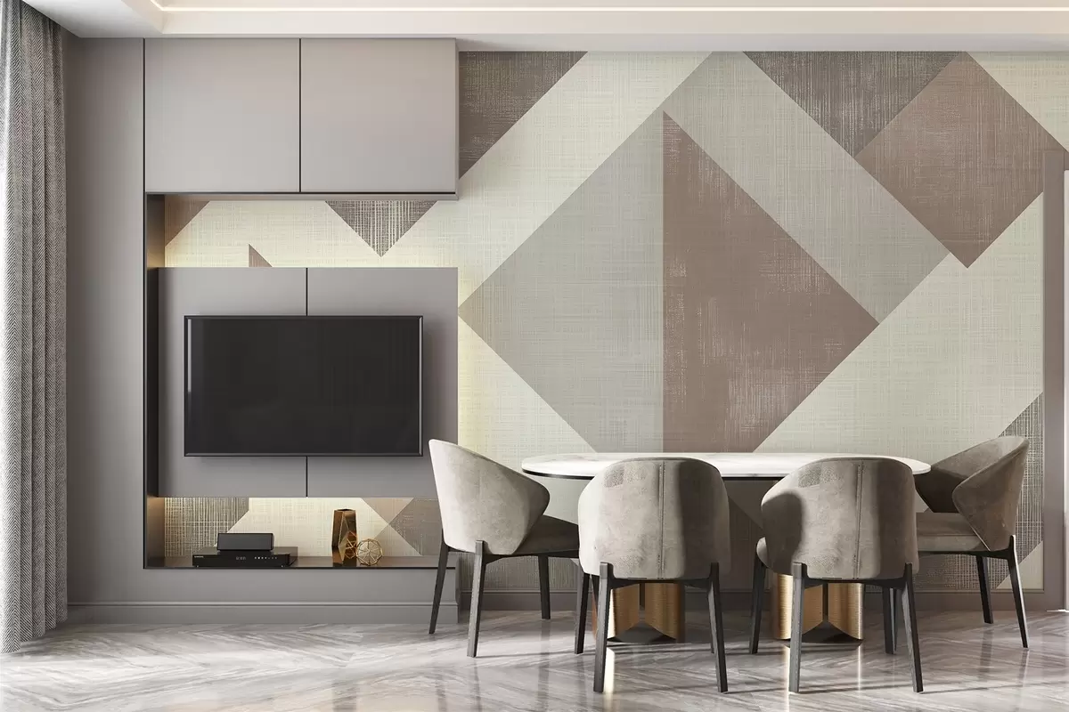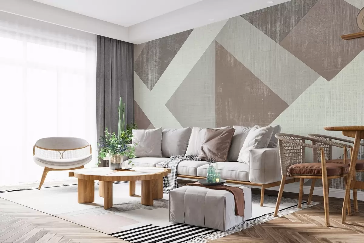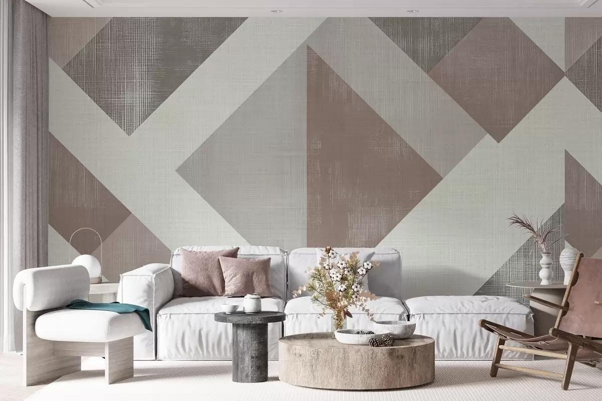 Fotobehang Modern geometrisch behangontwerp met overlappende vormen in zachte beige, groene en grijze tinten N° w02341v1