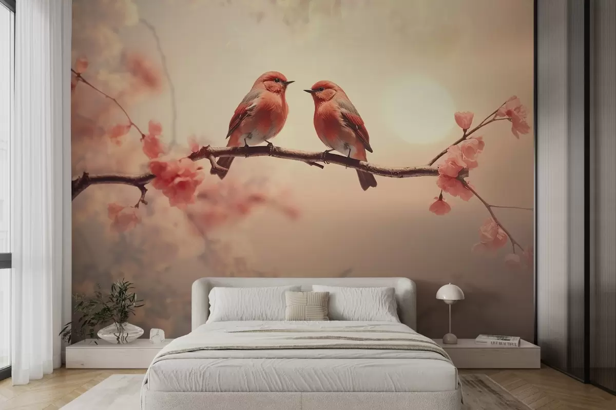 Fotobehang Een sereen en romantisch tafereel met twee vogeltjes op een delicate tak versierd met lichtroze bloemen. N° w02343