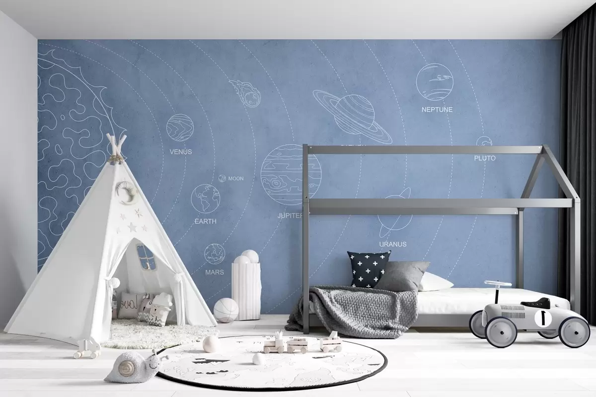 Fotobehang Zonnestelsel in minimalistische stijl op blauwe textuurachtergrond N° w02344v1