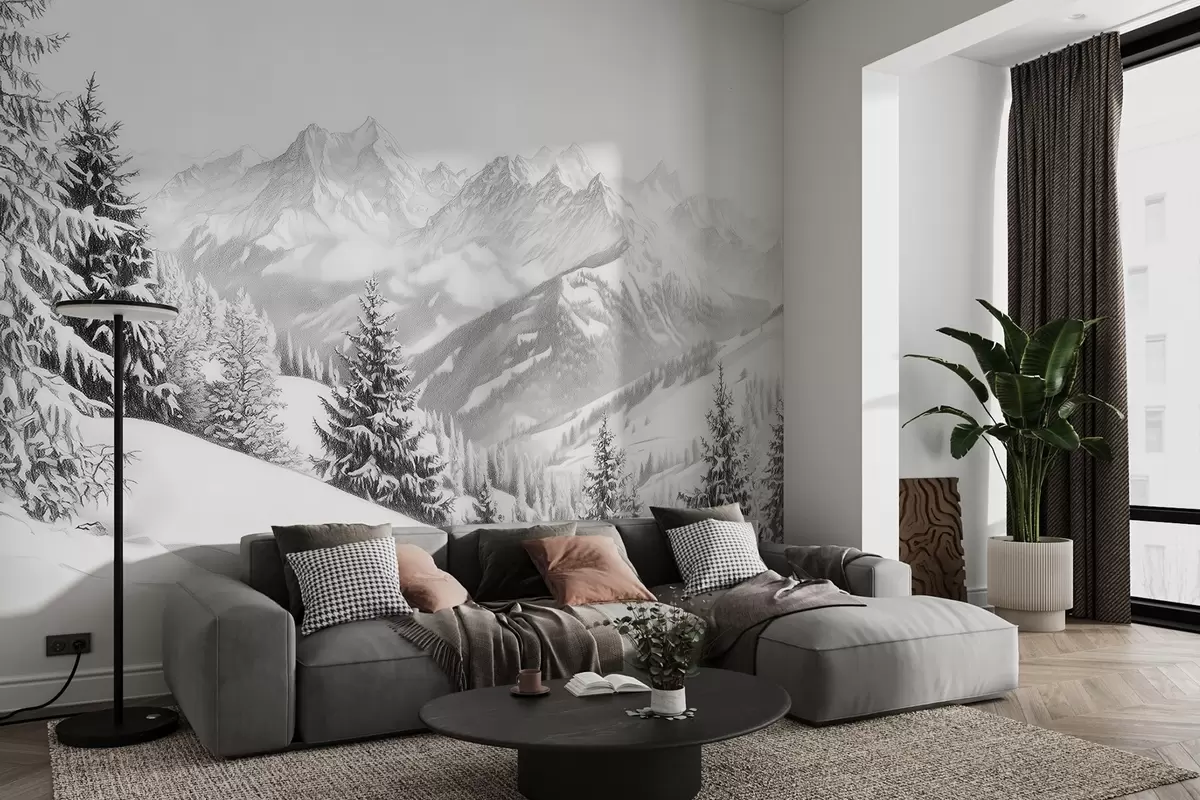 Fotobehang Winter in de bergen, bos, Alpen, potlood tekening, natuurlandschappen N° w02353