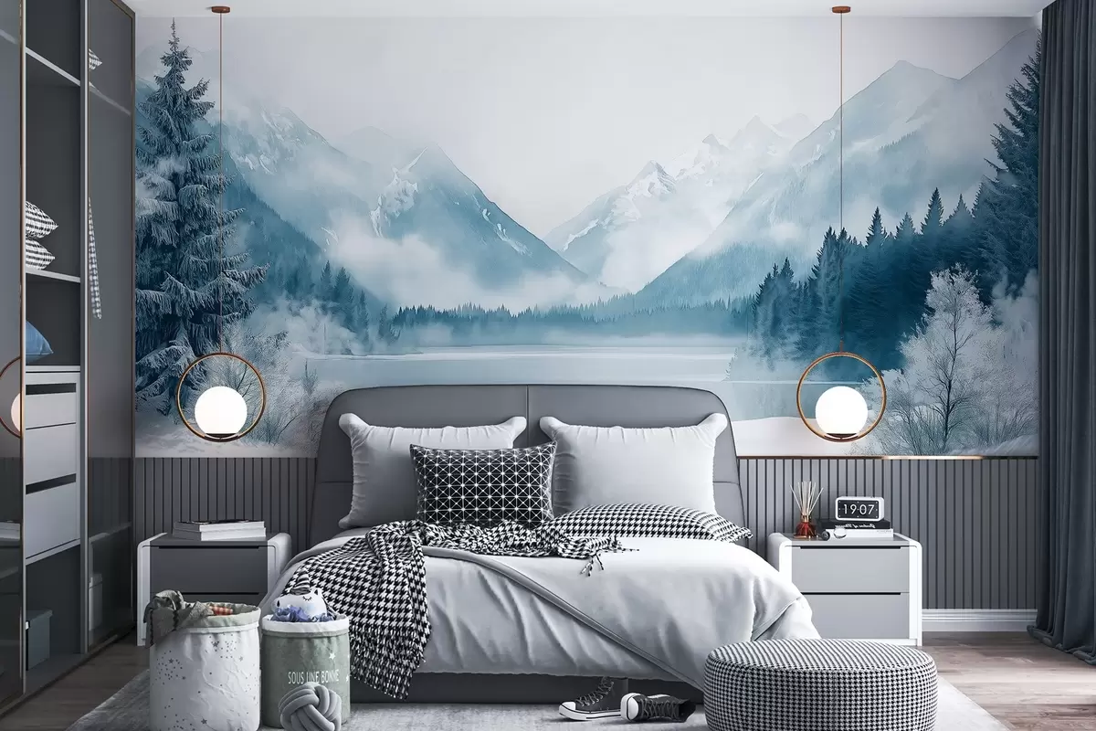 Fotobehang Winter bergen, bevroren meer, dennenbos, blauw kleurenpalet, aquarel stijl N° w02354
