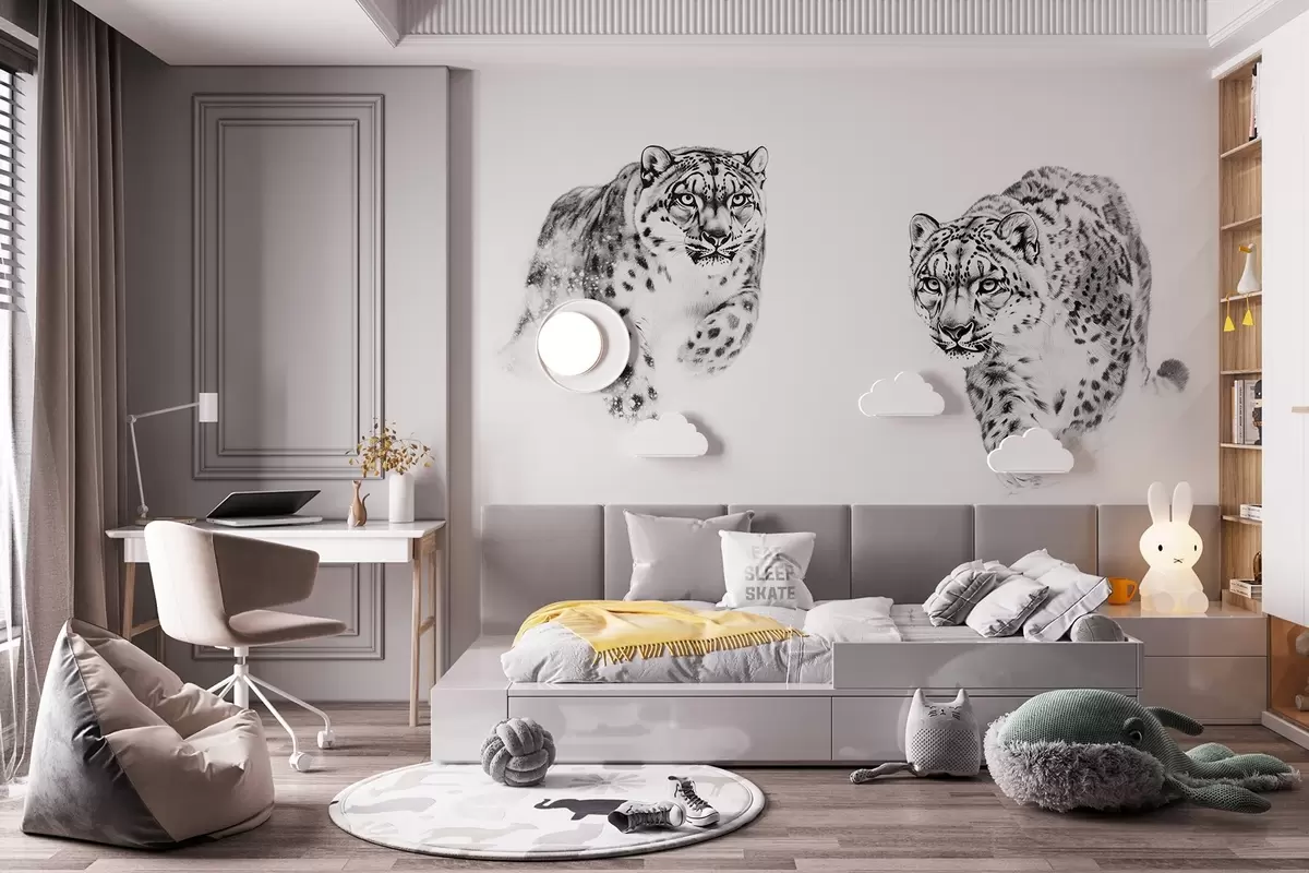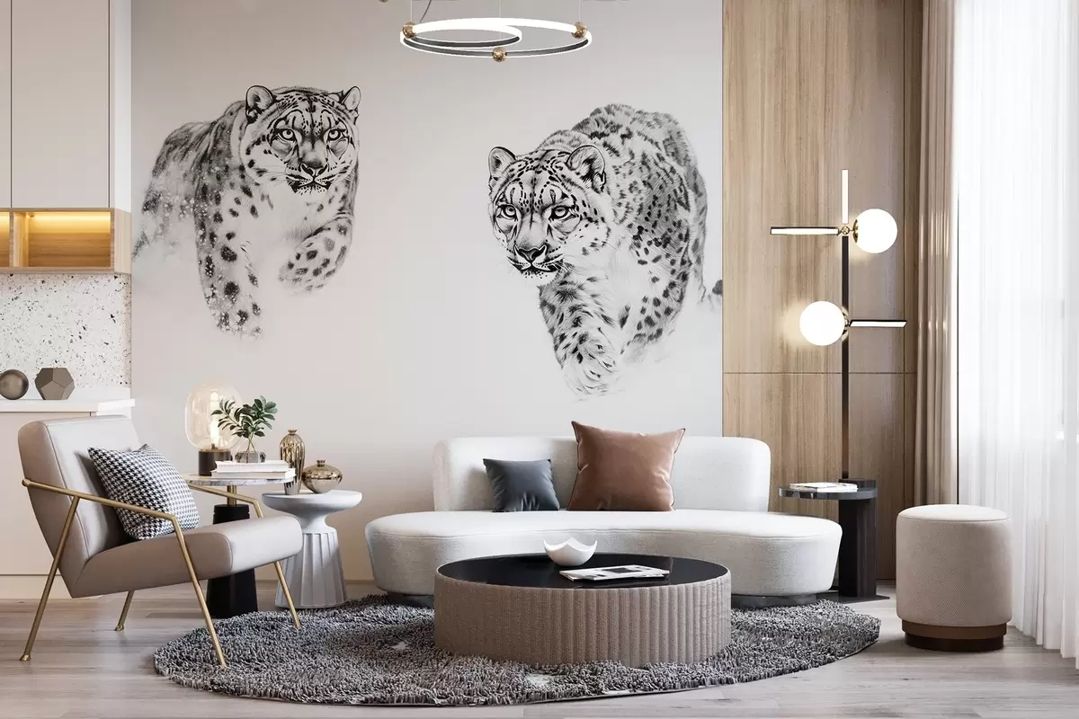 Fotobehang Sneeuwluipaarden, winter, wilde dieren, potloodtekening, minimalisme N° w02359