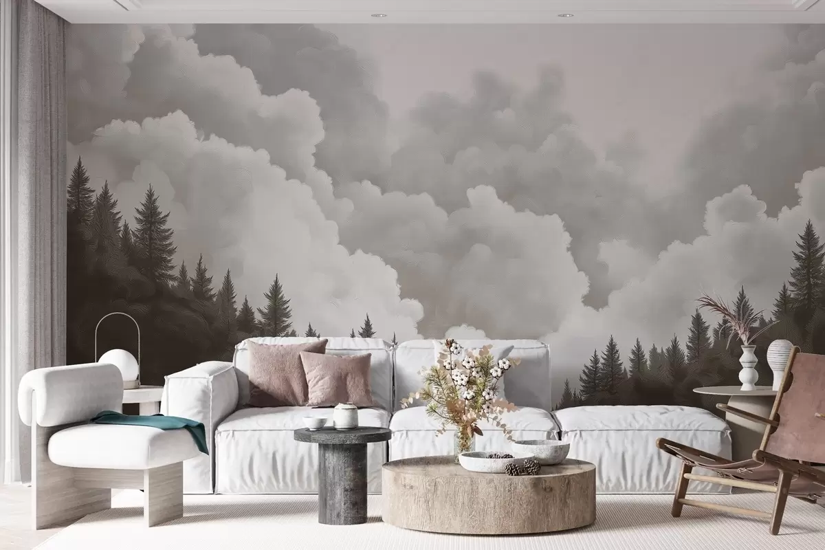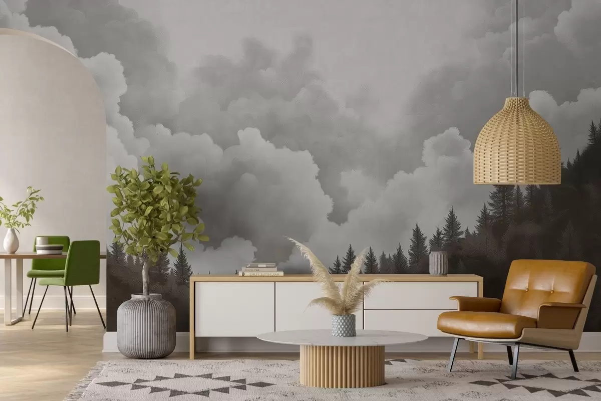 Fotobehang In olieverf geschilderde dikke wolken boven het bos N° w02411v1