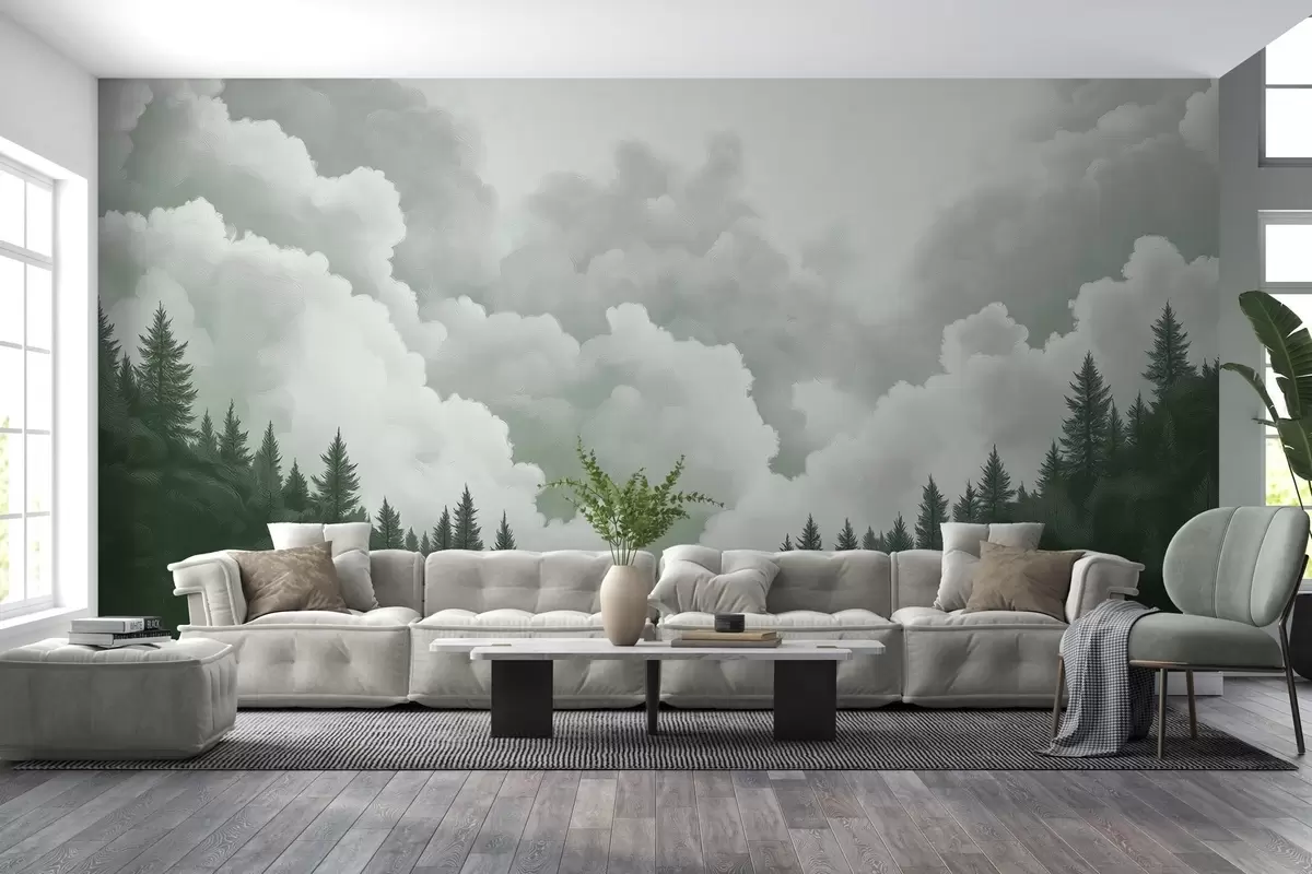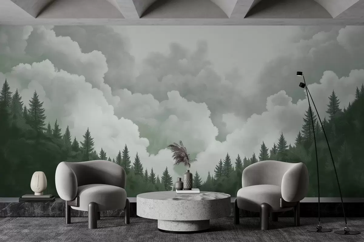 Fotobehang In olieverf geschilderde dikke wolken boven het bos N° w02411v2