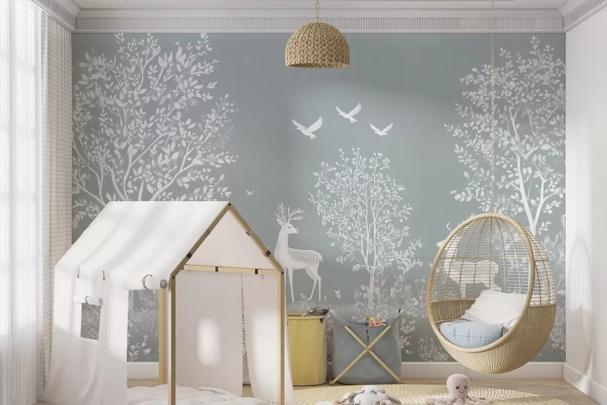 Fotobehang bos met herten in de stijl van een krijttekening op een grijze achtergrond N° w02444v2