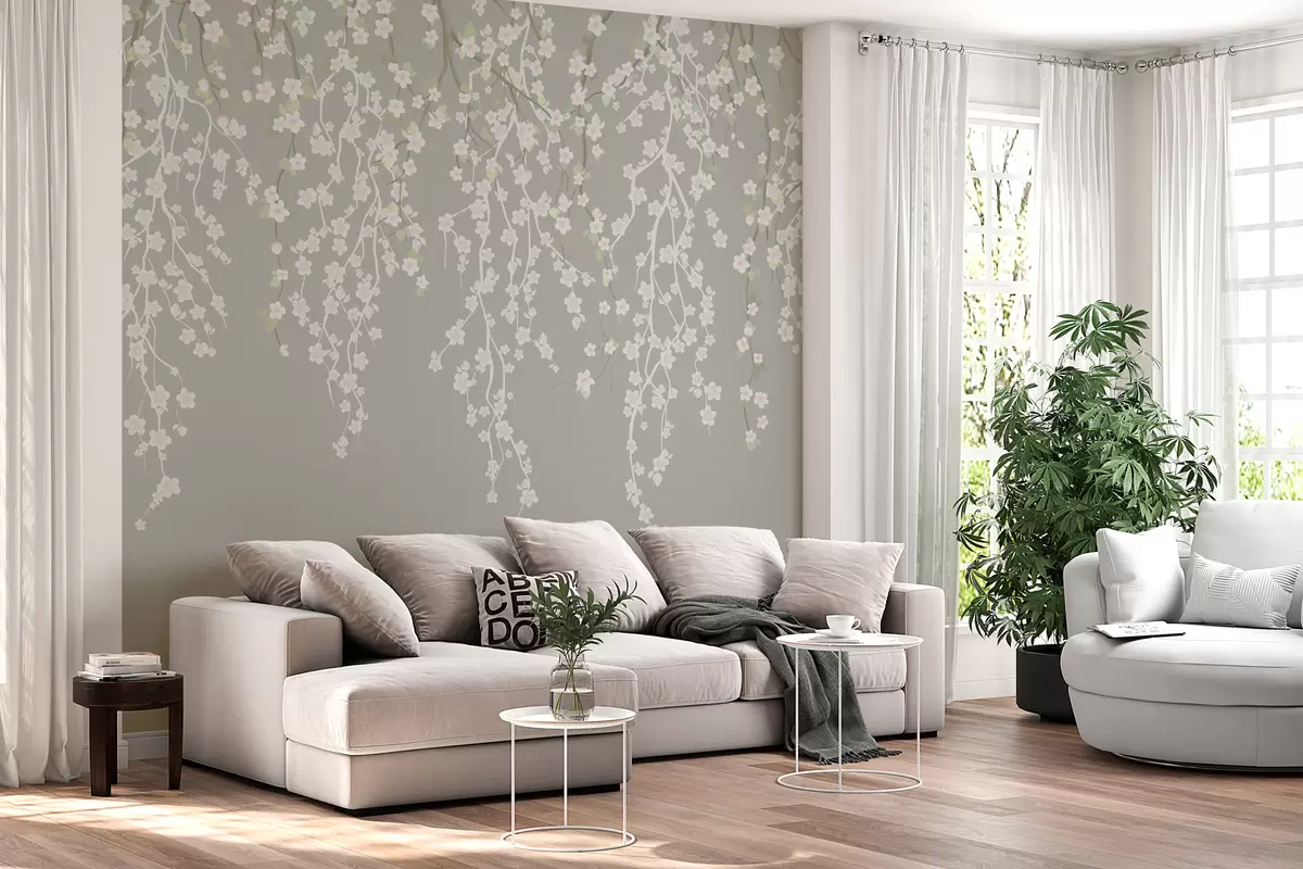 Fotobehang Vloeiende takken met bloemen op een grijze achtergrond N° w02479v1