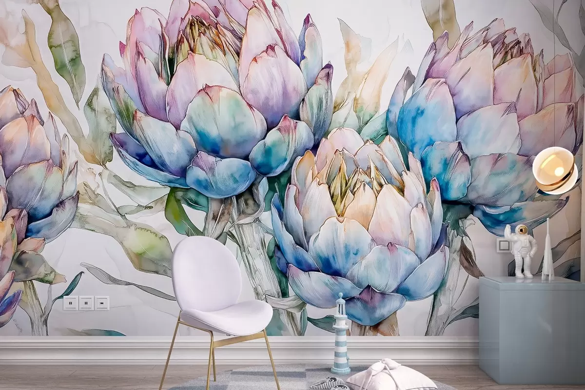 Fotobehang Artisjokken tekening, aquarel stijl, bloemig, paars, beige, groen N° w02484