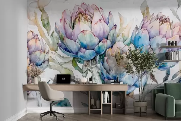 Fotobehang Artisjokken tekening, aquarel stijl, bloemig, paars, beige, groen N° w02484