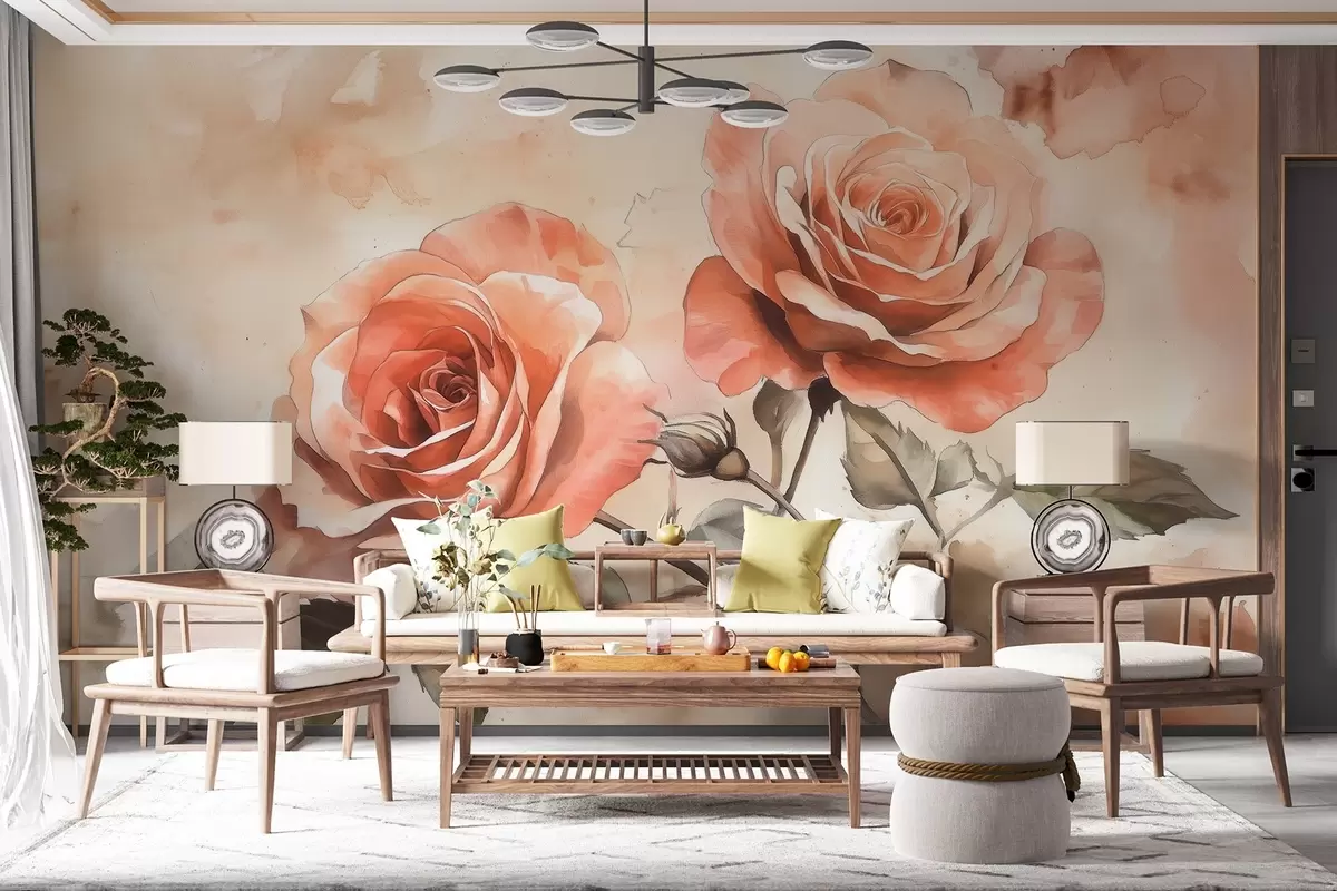 Fotobehang Mooie rode rozen in aquarelstijl, bloemig, beige kleuren N° w02486