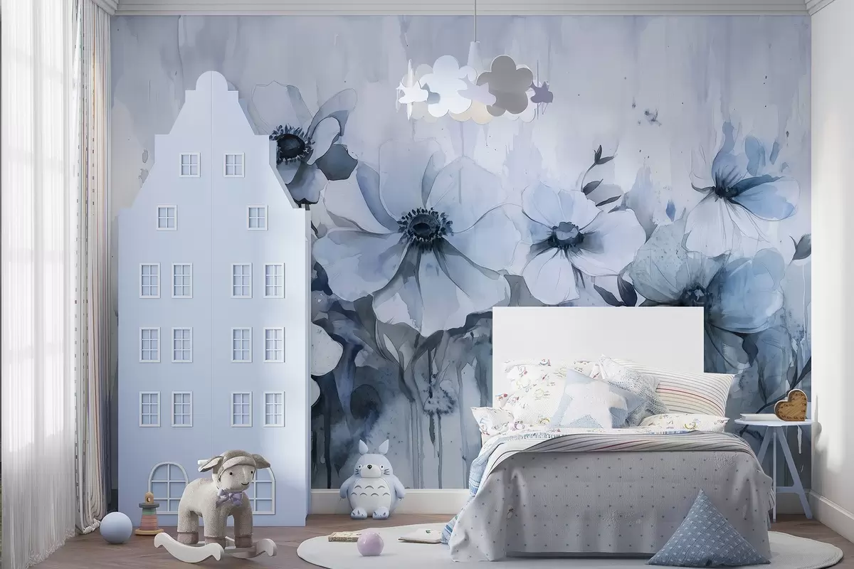 Fotobehang Rustieke bloemen, aquarel stijl tekening, blauwe kleuren N° w02487v1