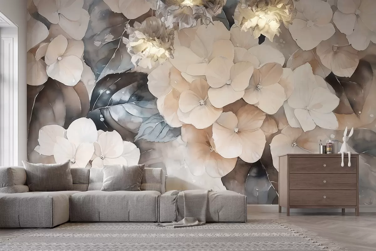 Fotobehang Hortensia bloemen, aquarel stijl tekening, beige kleuren, bloemig N° w02488