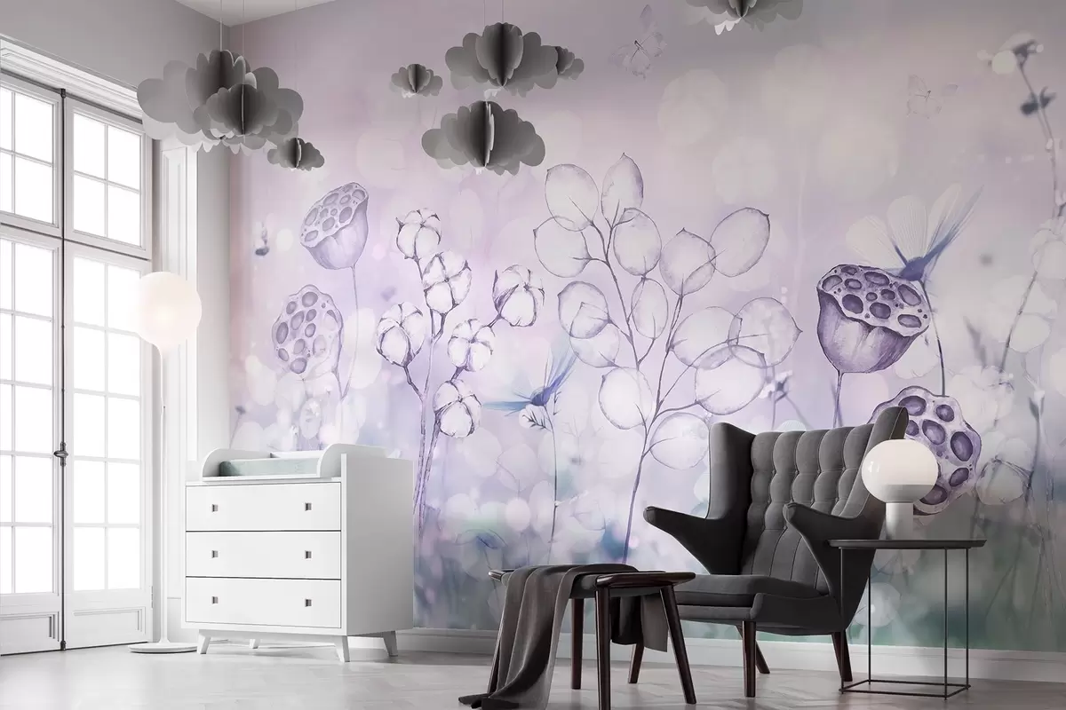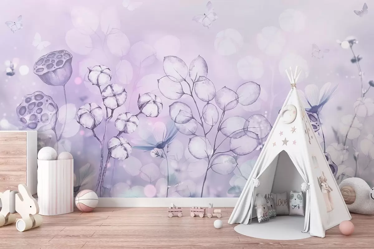 Fotobehang Dromerige bloementuin, vlinder, katoenen bloemen, lotussen, paarse kleuren N° w02516v1