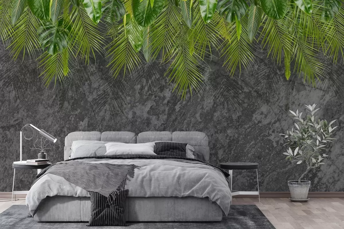 Fotobehang tropische bladeren op de achtergrond van imitatiesteen N° w02547