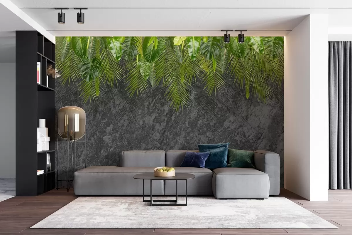 Fotobehang tropische bladeren op de achtergrond van imitatiesteen N° w02547